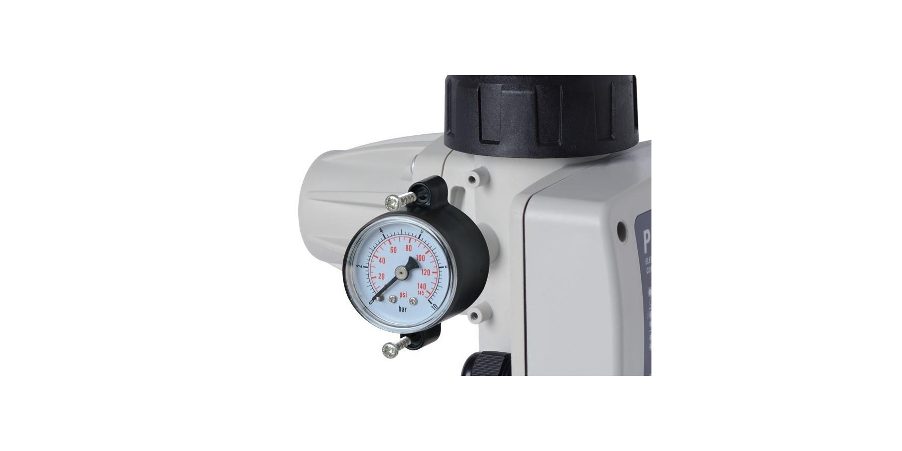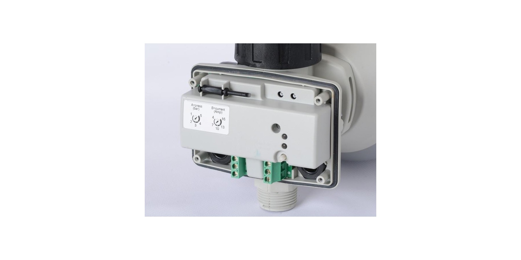 Caratteristica principale di Presflo Vario é quella di poter variare la pressione di intervento della pompa da 0.8 a 2.4 bar con molta facilità agendo sul pomello posizionato nella sua parte posteriore, quindi girando a destra o sinistra il pomello nero del fondo si avrà la modifica della pressione di marcia visualizzata sul manonometro installato sul lato sinistro.