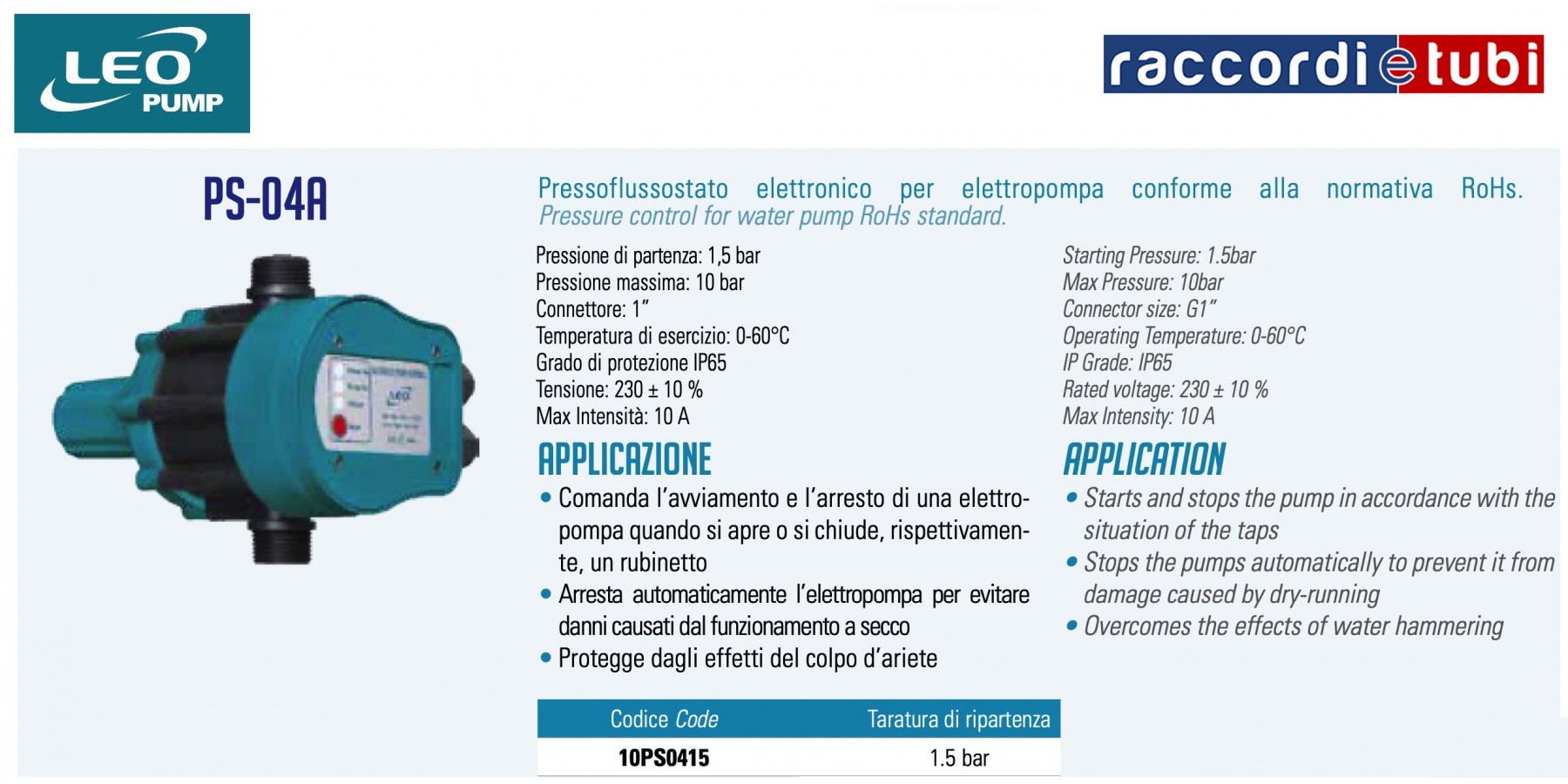 Pressoflussostato elettronico per elettropompa conforme alla normativa RoHs.
