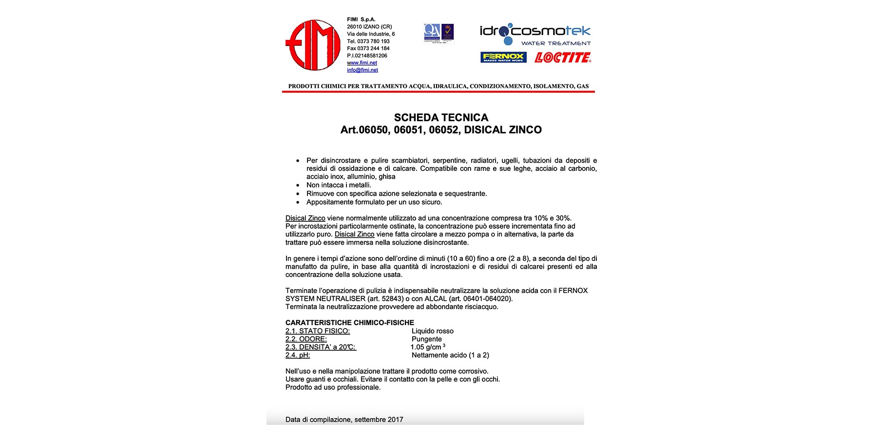 DISICAL ZINCO è un liquido a viraggio di colorazione inibito specifico per la rimozione rapida di incrostazioni calcaree ed ossidi da scambiatori di calore e superfici metalliche. DISICAL ZINCO è compatibile con tutti i metalli (alluminio e inox inclusi). Terminata la disincrostazione è necessario neutralizzare la soluzione acida con ALCAL. Percentuale di diluizione consigliata: 10%-20%. Prodotto ad uso professionale, consultare la scheda tecnica prima dell’utilizzo