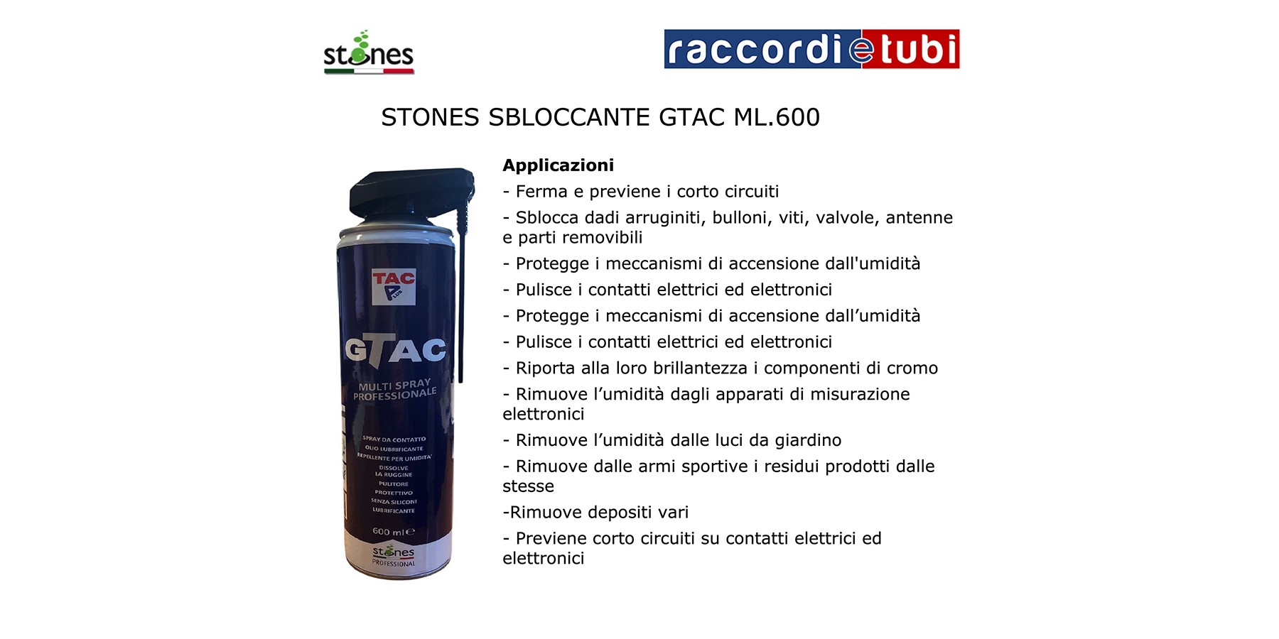 Repelle velocemente l'umidità, ha una bassa tensione di superficie e forti capacità penetranti. Grazie all'effetto arricciatura a freddo, GTAC rompe i cristalli di ruggine in pochissimo tempo. Le capacità penetranti di GTAC permettono di lubrificare anche le aperture più microscopiche. GTAC evita l'ossidazione ed è lo spray ideale per sistemi elettrici, elettrodomestici, clip di batteria, scatole di distribuzione e molto altro. GTAC pulisce utensili pneumatici, blocchi cilindrici, depositi di catrame e fluido freni. GTAC riempie applanarità e pori e crea uno strato duraturo e trasparente. Un singolo prodotto, innovativo e di alta qualità. GTAC è uno spray estremamente versatile, che consente di liberare un sacco di spazio sui vostri scaffali, perché è uno spray potente contro la ruggine e l'umidità, è un olio lubrificante di alta qualità, è uno spray a contatto, perfetto per sistemi elettrici, è un efficace pulitore in grado di proteggere tutte le superfici. GTAC può essere utilizzato per proteggere dall'umidità e dai corto circuiti utensili elettrici e pneumatici. Ma GTAC è perfetto anche per la manutenzione di mountain bike e biciclette da corsa, o semplicemente per eliminare cigolii e scricchiolii. GTAC protegge la carrozzeria dell'auto dall'azione corrosiva del sale raccolto sulle strade ed è efficace nella protezione di cerchioni, parti cromate, etc.