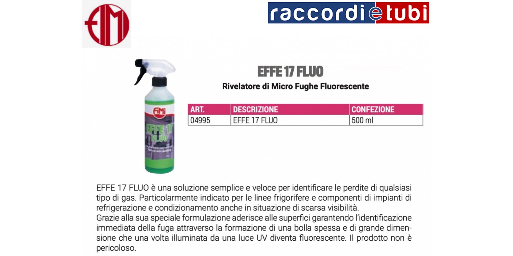 EFFE 17 FLUO è una soluzione semplice e veloce per identificare le perdite di qualsiasi tipo di gas. Particolarmente indicato per le linee frigorifere e componenti di impianti di refrigerazione e condizionamento anche in situazione di scarsa visibilità.