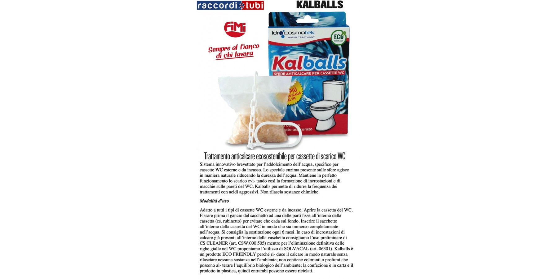 Adatto a tutti i tipi di cassette WC esterne e da incasso. Aprire la cassetta del WC. Fissare prima il gancio del sacchetto ad una delle parti fisse all’interno della cassetta (es. rubinetto) per evitare che cada sul fondo. Inserire il sacchetto all’interno della cassetta del WC in modo che sia immerso completamente nell’acqua. Si consiglia la sostituzione ogni 6 mesi. In caso di incrostazioni di calcare già presenti all’interno della vaschetta consigliamo l’uso preliminare di CS CLEANER (art. CSW.000.505) mentre per l’eliminazione definitiva delle righe gialle nel WC proponiamo l’utilizzo di SOLVACAL (art. 06301). Kalballs è un prodotto ECO FRIENDLY perché ri- duce il calcare in modo naturale senza rilasciare nessuna sostanza nell’ambiente; non contiene coloranti o profumi che possono al- terare l’equilibrio biologico dell’ambiente; la confezione è in carta e il prodotto in plastica, quindi entrambi possono essere riciclati.