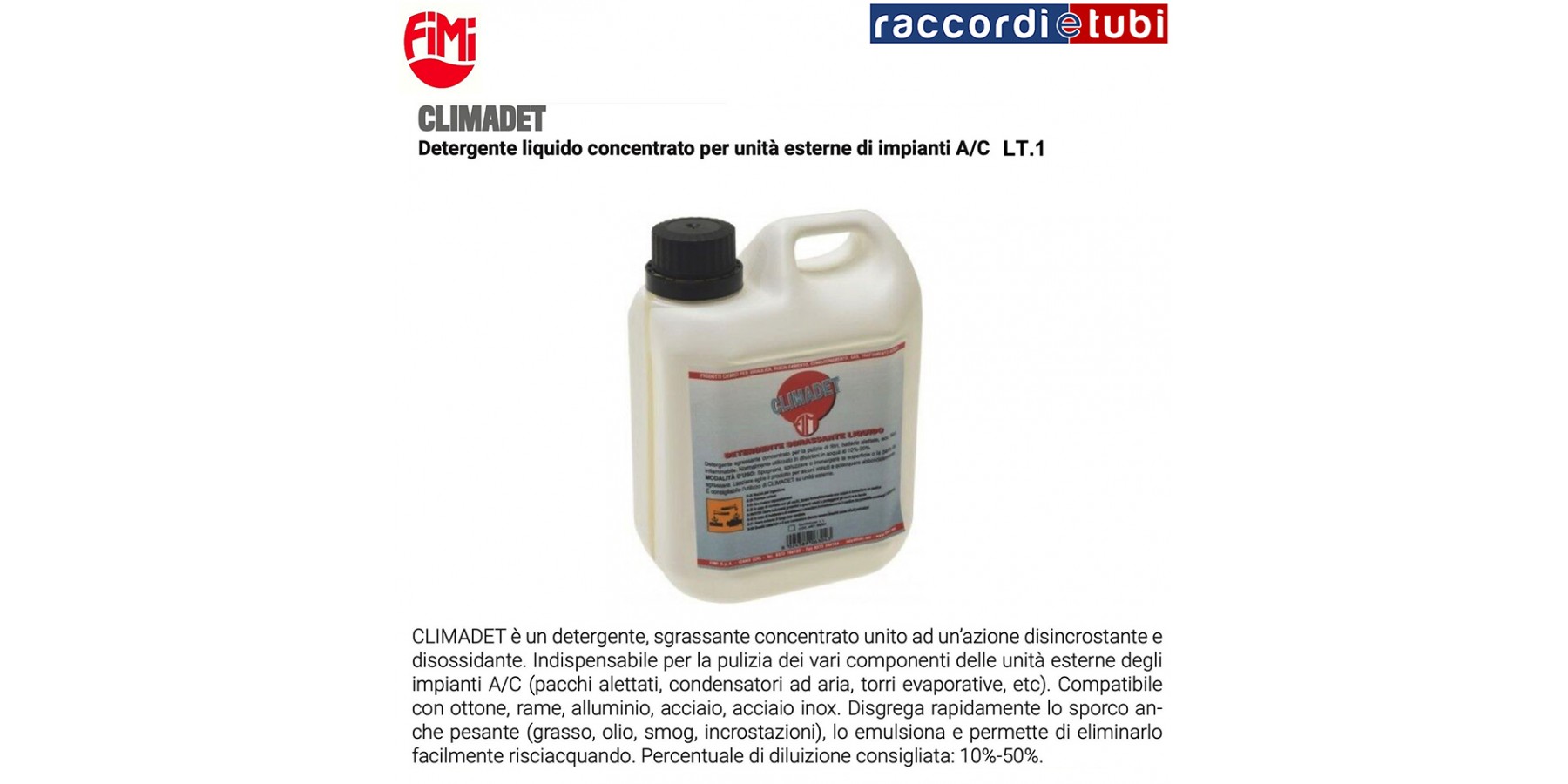 CLIMADET è un detergente, sgrassante concentrato unito ad un’azione disincrostante e disossidante. Indispensabile per la pulizia dei vari componenti delle unità esterne degli impianti A/C (pacchi alettati, condensatori ad aria, torri evaporative, etc). Compatibile con ottone, rame, alluminio, acciaio, acciaio inox. Disgrega rapidamente lo sporco an- che pesante (grasso, olio, smog, incrostazioni), lo emulsiona e permette di eliminarlo facilmente risciacquando. Percentuale di diluizione consigliata: 10%-50%.