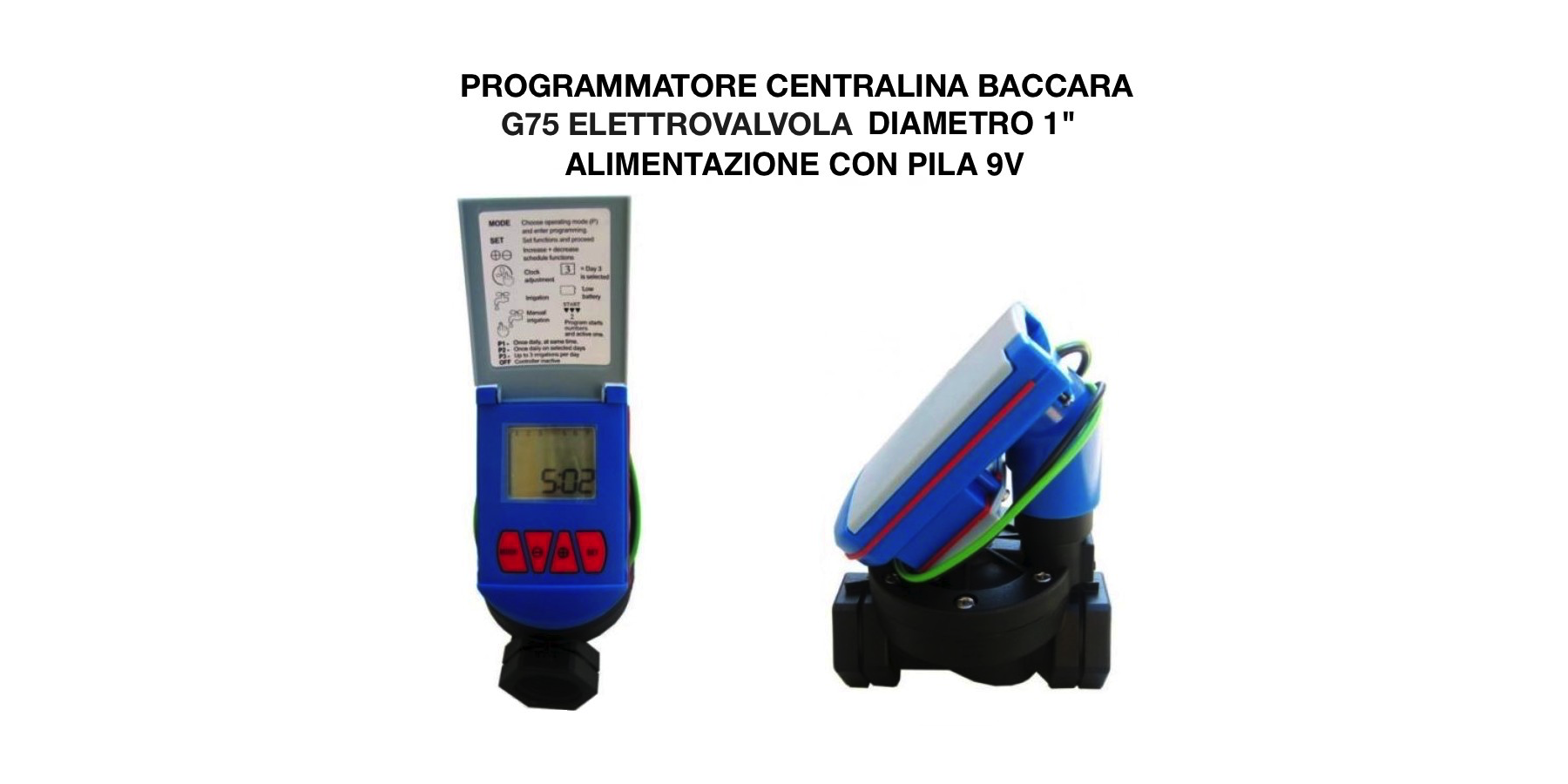 Programmatore a batteria monostazione Baccara, montato su elettrovalvola da 1" Femmina Baccara G75. Nel reparto raccorderia filettata sono disponibili riduzioni che riducono il filetto in entrata ed in uscita a 3/4" Femmina o maschio.