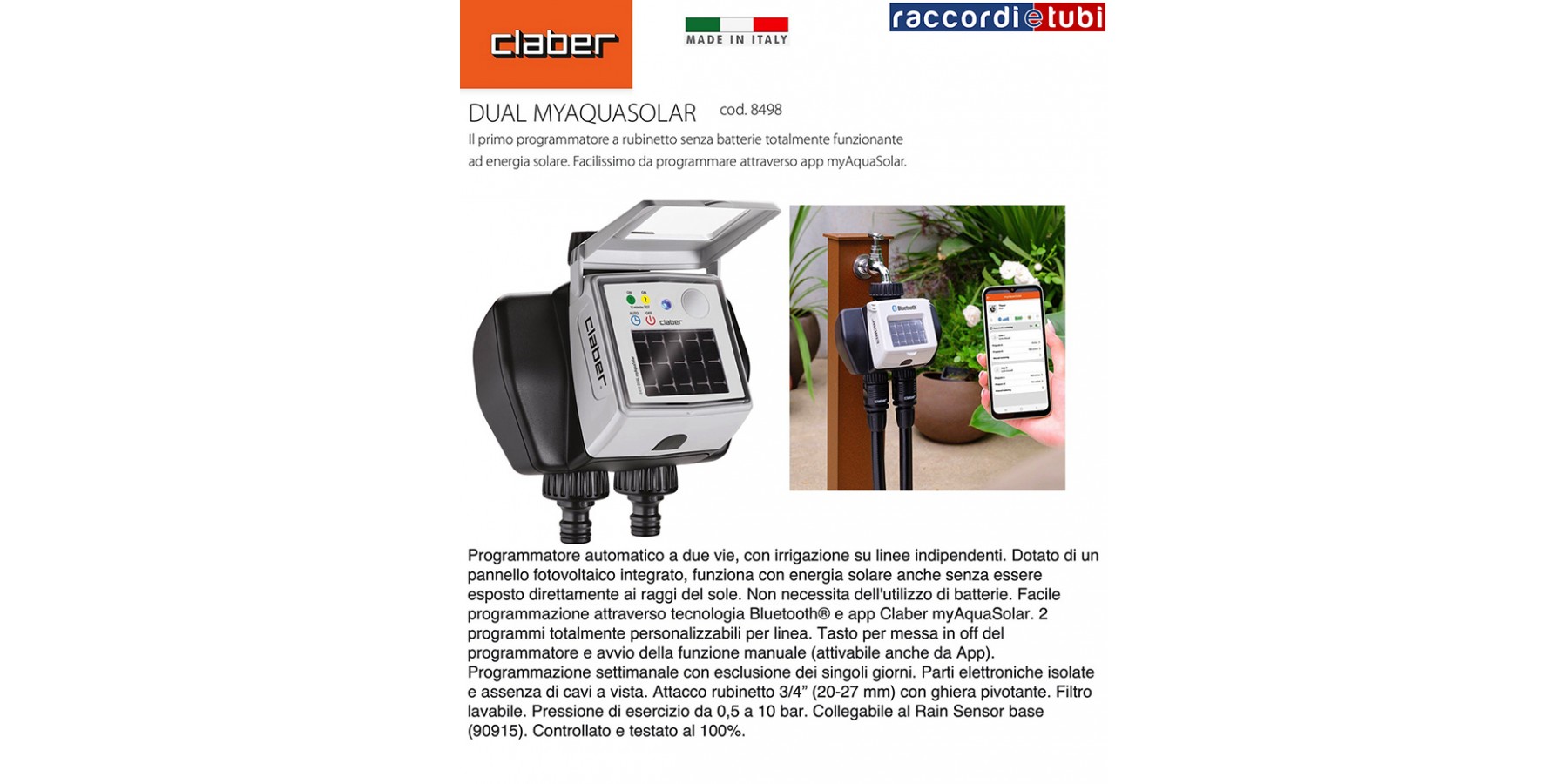 Programmatore automatico a due vie, con irrigazione su linee indipendenti. Dotato di un pannello fotovoltaico integrato, funziona con energia solare anche senza essere esposto direttamente ai raggi del sole. Non necessita dell'utilizzo di batterie. Facile programmazione attraverso tecnologia Bluetooth® e app Claber myAquaSolar. 2 programmi totalmente personalizzabili per linea. Tasto per messa in off del programmatore e avvio della funzione manuale (attivabile anche da App). Programmazione settimanale con esclusione dei singoli giorni. Parti elettroniche isolate e assenza di cavi a vista. Attacco rubinetto 3/4" (20-27 mm) con ghiera pivotante. Filtro lavabile. Pressione di esercizio da 0,5 a 10 bar. Collegabile al Rain Sensor base (90915). Controllato e testato al 100%.