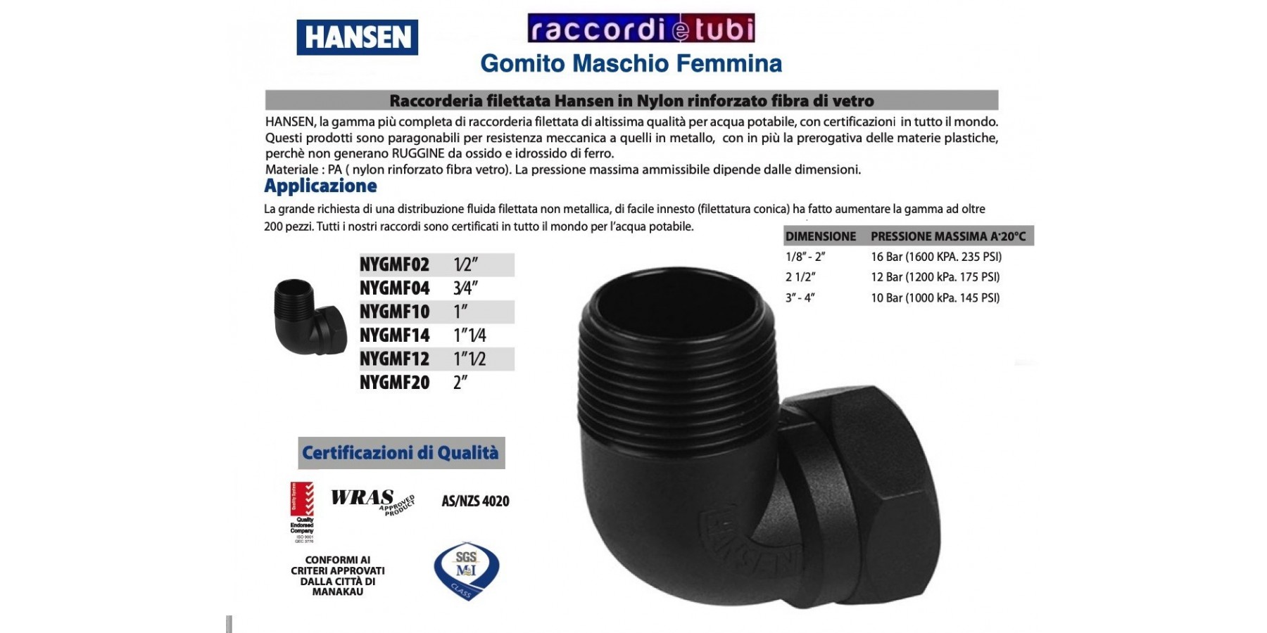 HANSEN, la gamma più completa di raccorderia filettata di altissima qualità per acqua potabile, con certificazioni in tutto il mondo. Questi prodotti sono paragonabili per resistenza meccanica a quelli in metallo, con in più la prerogativa delle materie plastiche, perchè non generano RUGGINE da ossido e idrossido di ferro. Materiale : PA ( nylon rinforzato fibra vetro). La pressione massima ammissibile dipende dalle dimensioni. Applicazione La grande richiesta di una distribuzione fluida filettata non metallica, di facile innesto (filettatura conica) ha fatto aumentare la gamma ad oltre 200 pezzi. Tutti i nostri raccordi sono certificati in tutto il mondo per l’acqua potabile.