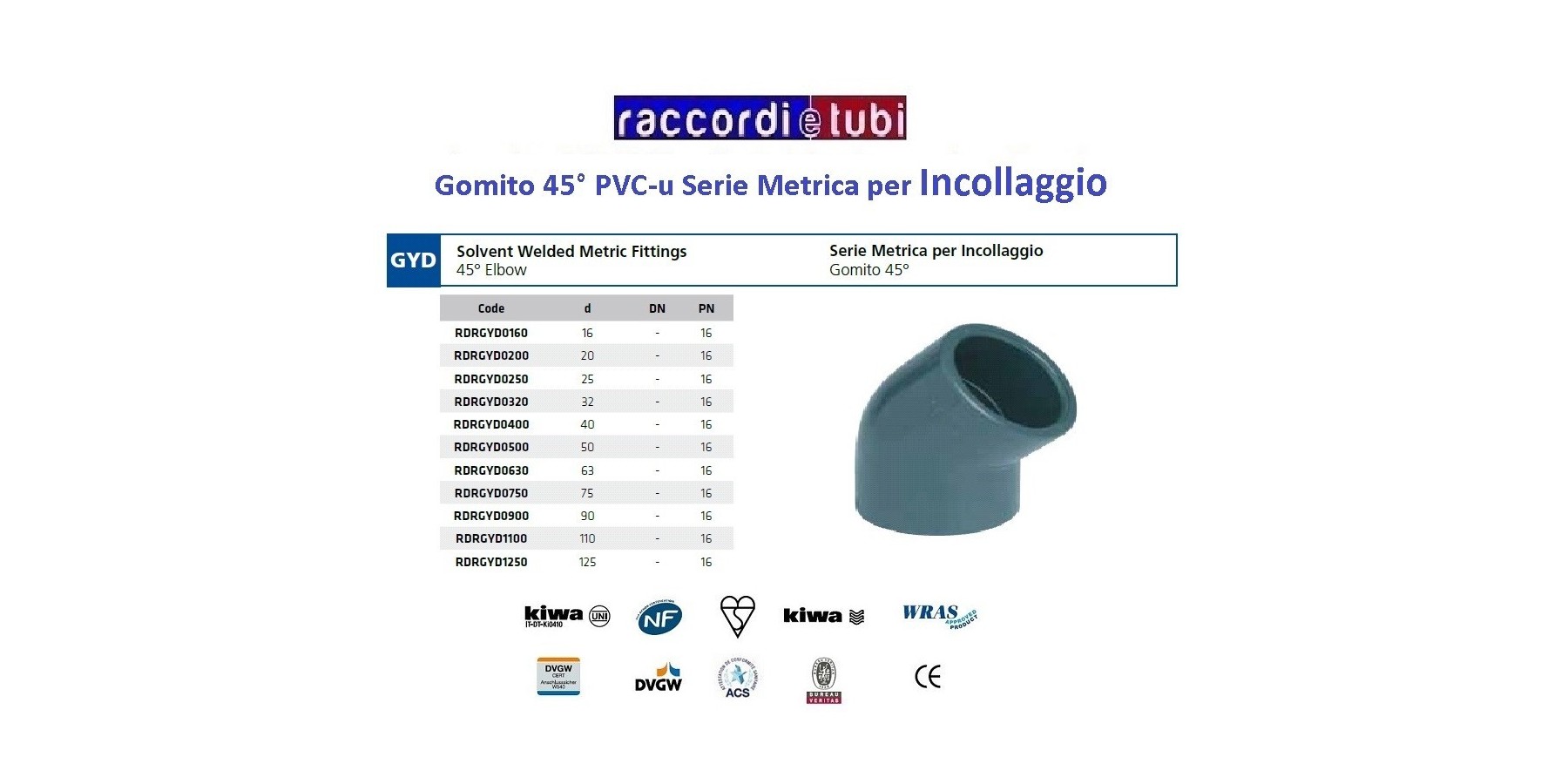 GOMITO PVC INCOLLAGGIO DIAMETRO 63 GRADI 45