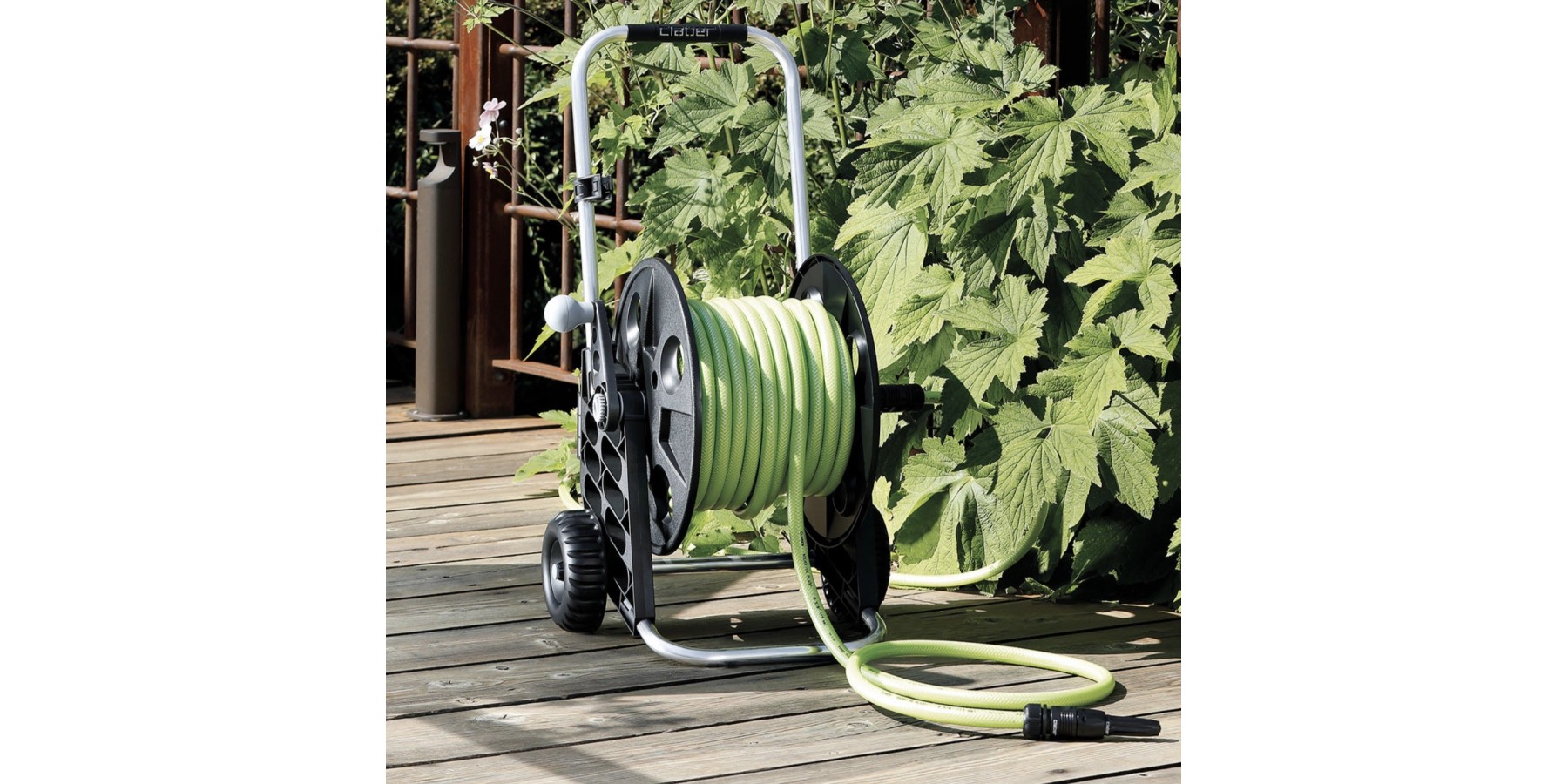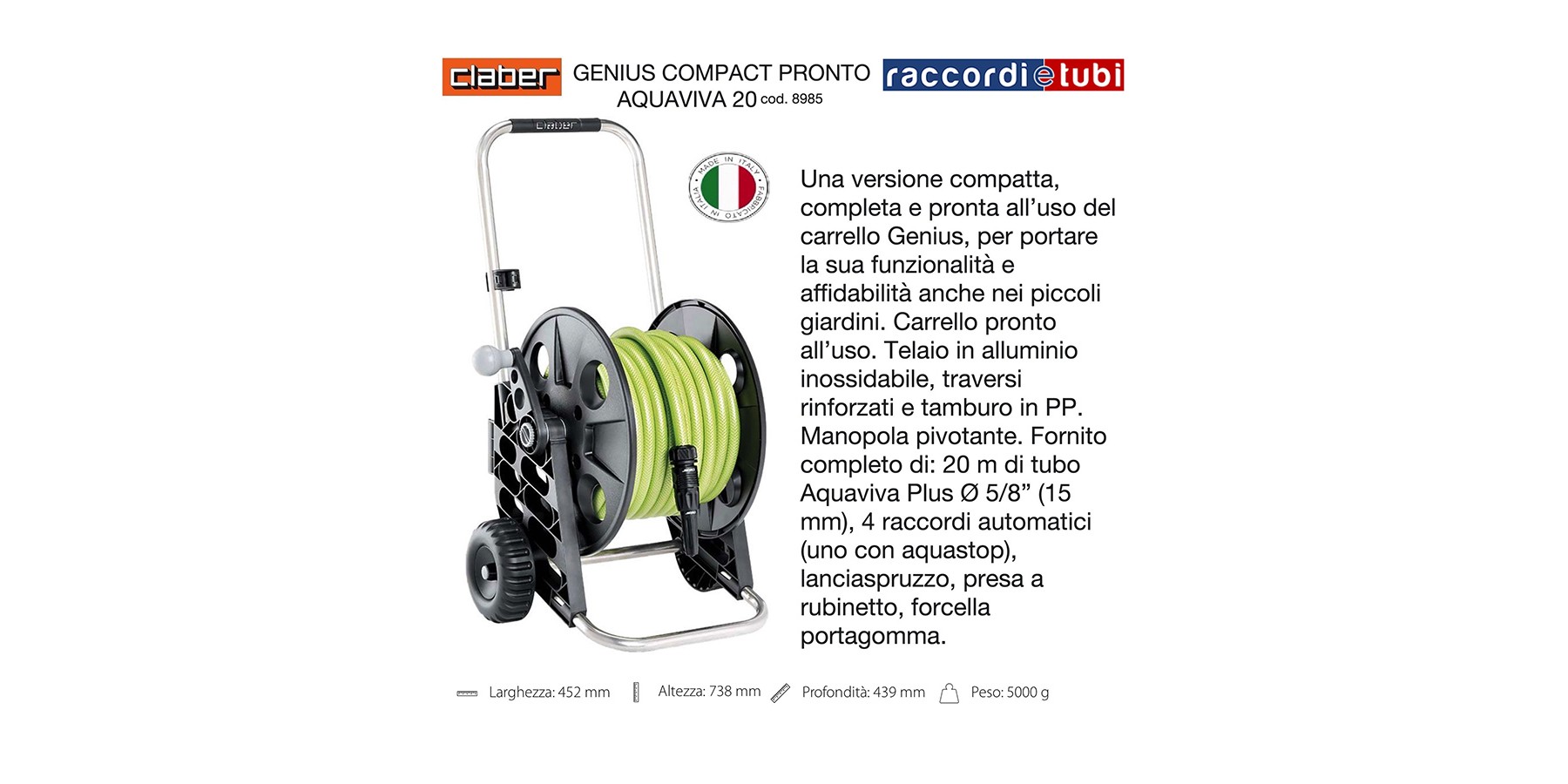 Carrello pronto all’uso. Telaio in alluminio inossidabile, traversi rinforzati e tamburo in PP. Manopola pivotante. Fornito completo di: 20 m di tubo Aquaviva Plus Ø 5/8” (15 mm), 4 raccordi automatici (uno con aquastop), lanciaspruzzo, presa a rubinetto, forcella portagomma.
