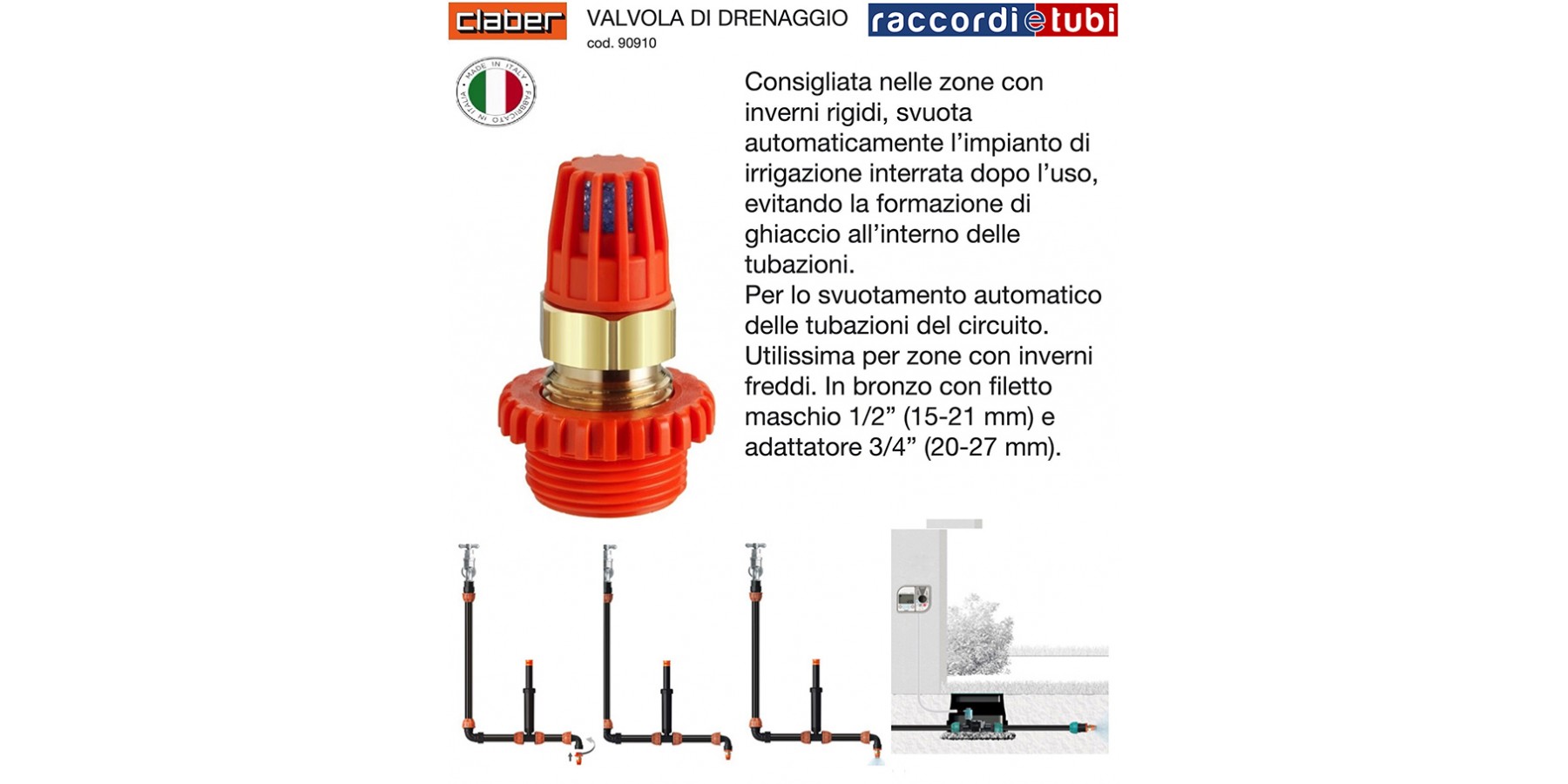 Per lo svuotamento automatico delle tubazioni del circuito. Utilissima per zone con inverni freddi. In bronzo con filetto maschio 1/2” (15-21 mm) e adattatore 3/4” (20-27 mm).
