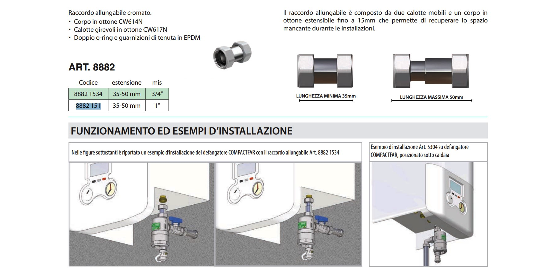 Raccordo allungabile cromato. • Corpo in ottone CW614N • Calotte girevoli in ottone CW617N • Doppio o-ring e guarnizioni di tenuta in EPDM