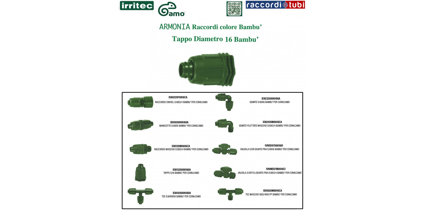 Raccorderia IRRITEC-CAMO diametro 16 per tubo PE bassa densita'  e ala Gocciolante, Dedicata in particolamete per i suoi colori Noce e Bambu' NEW Progetto IRRITEC  Camo