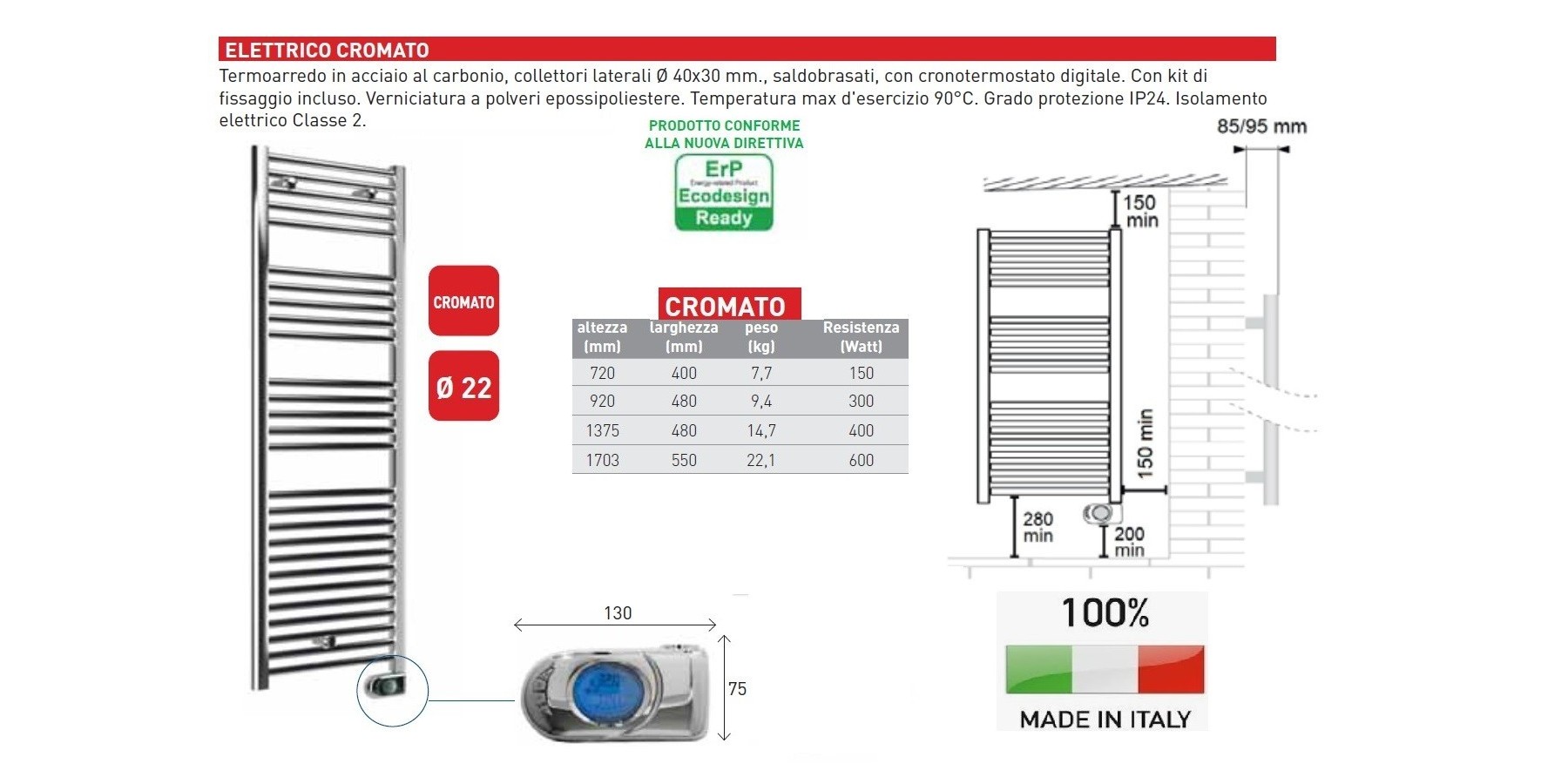 Termoarredo in acciaio al carbonio,CROMATO collettori laterali Ø 40x30 mm., saldobrasati, con cronotermostato digitale. Con kit di