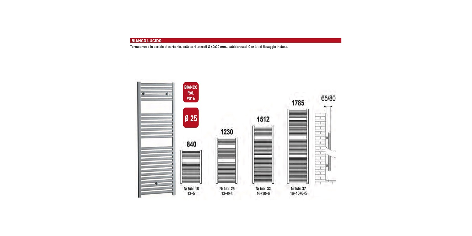 I termoarredo Lazzarini serie Roma/Giada/Acqua, in acciaio al carbonio con collettori laterali a forma di D 40x30 mm e tubo orizzontale di diametro 25 mm saldobrasato.