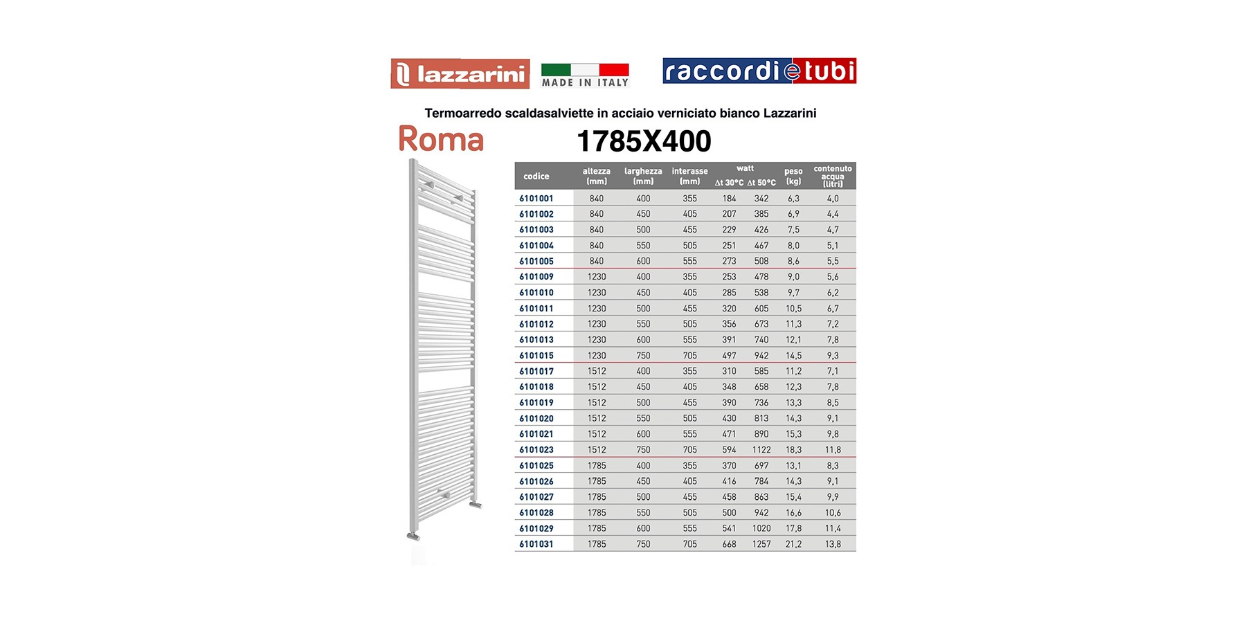 I termoarredo Lazzarini serie Roma/Giada/Acqua, in acciaio al carbonio con collettori laterali a forma di D 40x30 mm e tubo orizzontale di diametro 25 mm saldobrasato.