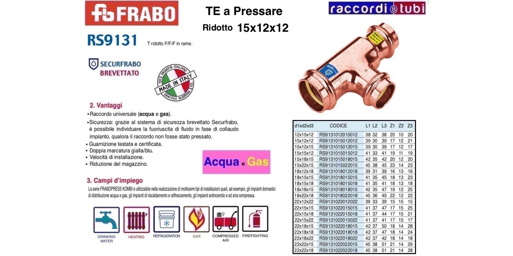 FRABOPRESS KOMBI, con sistema Securfrabo, è una serie costituita da raccordi a pressare in rame e bronzo disponibile nella gamma dimensionale compresa tra 12 e 54 mm, applicabile sia per impianti convoglianti gas che acqua.