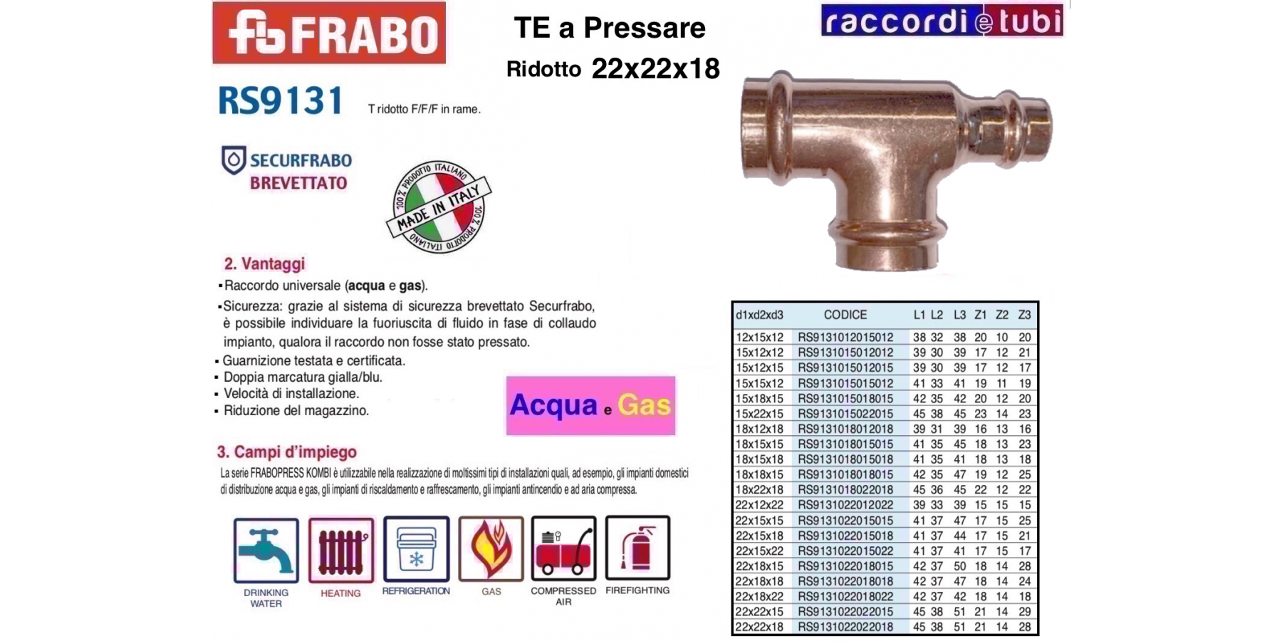 FRABOPRESS KOMBI, con sistema Securfrabo, è una serie costituita da raccordi a pressare in rame e bronzo disponibile nella gamma dimensionale compresa tra 12 e 54 mm, applicabile sia per impianti convoglianti gas che acqua.