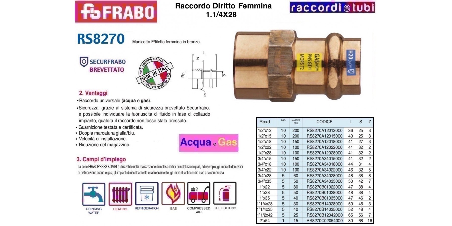 FRABOPRESS KOMBI, con sistema Securfrabo, è una serie costituita da raccordi a pressare in rame e bronzo disponibile nella gamma dimensionale compresa tra 12 e 54 mm, applicabile sia per impianti convoglianti gas che acqua.