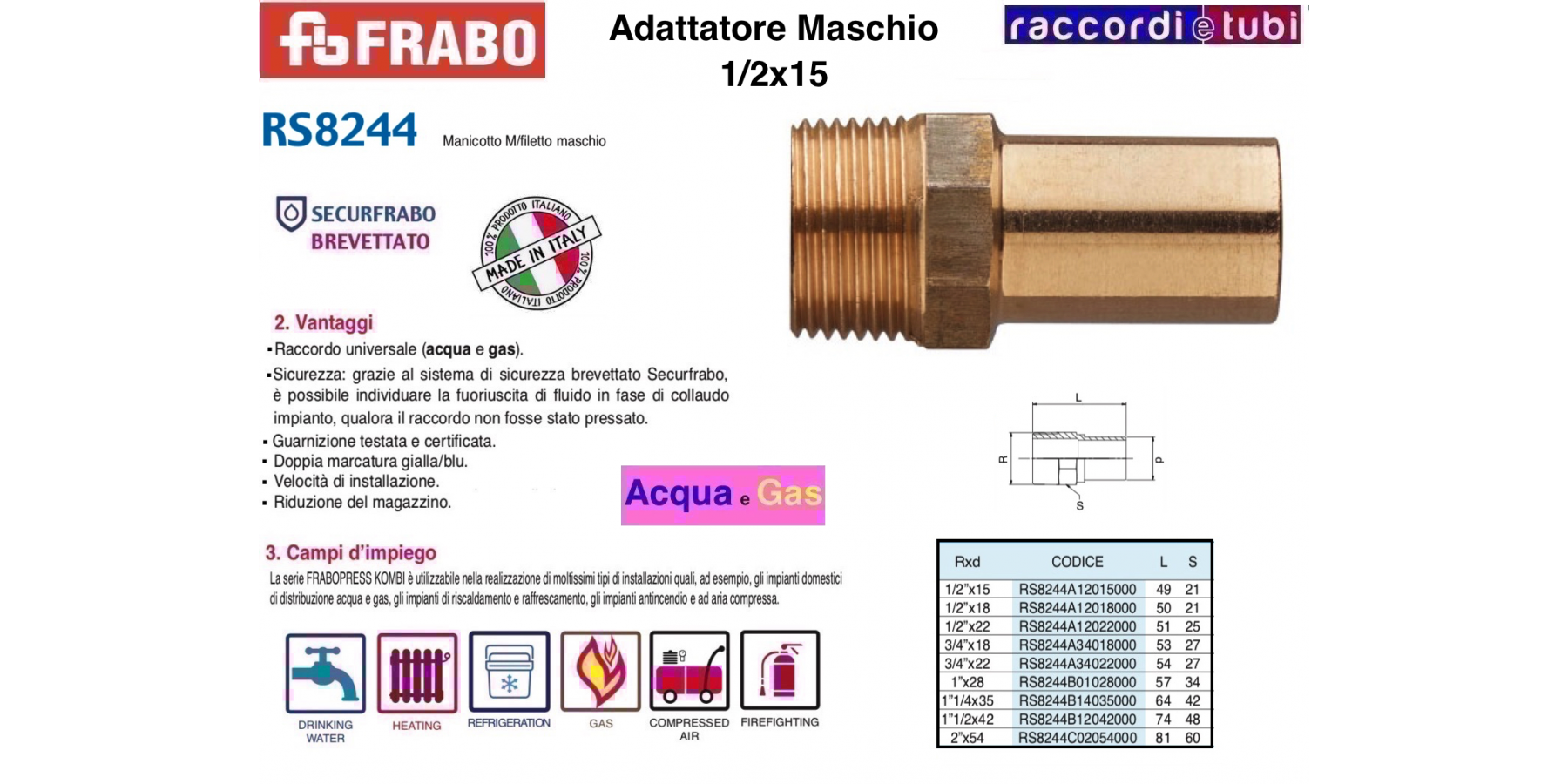 FRABOPRESS KOMBI, con sistema Securfrabo, è una serie costituita da raccordi a pressare in rame e bronzo disponibile nella gamma dimensionale compresa tra 12 e 54 mm, applicabile sia per impianti convoglianti gas che acqua.