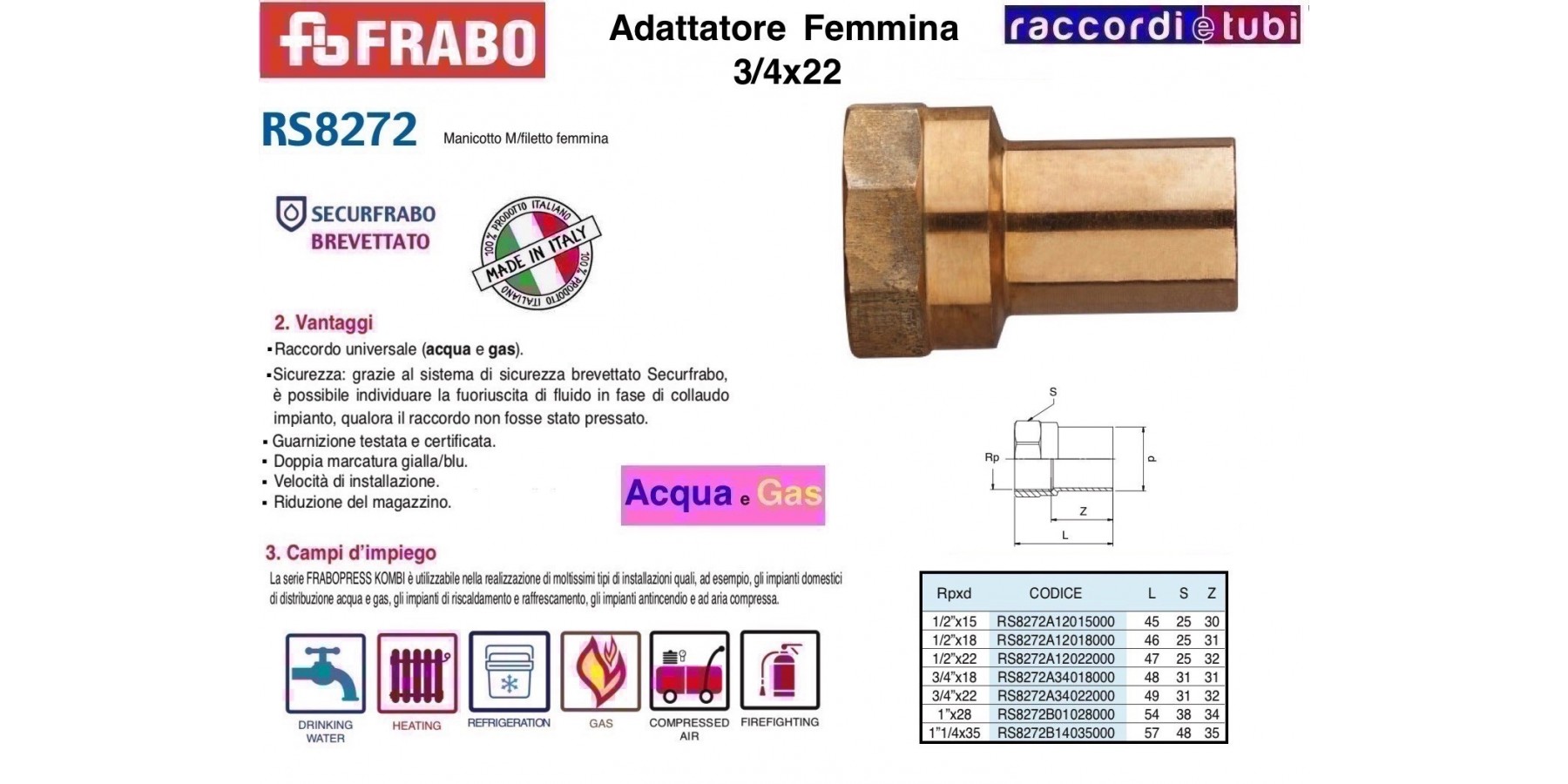 FRABOPRESS KOMBI, con sistema Securfrabo, è una serie costituita da raccordi a pressare in rame e bronzo disponibile nella gamma dimensionale compresa tra 12 e 54 mm, applicabile sia per impianti convoglianti gas che acqua.