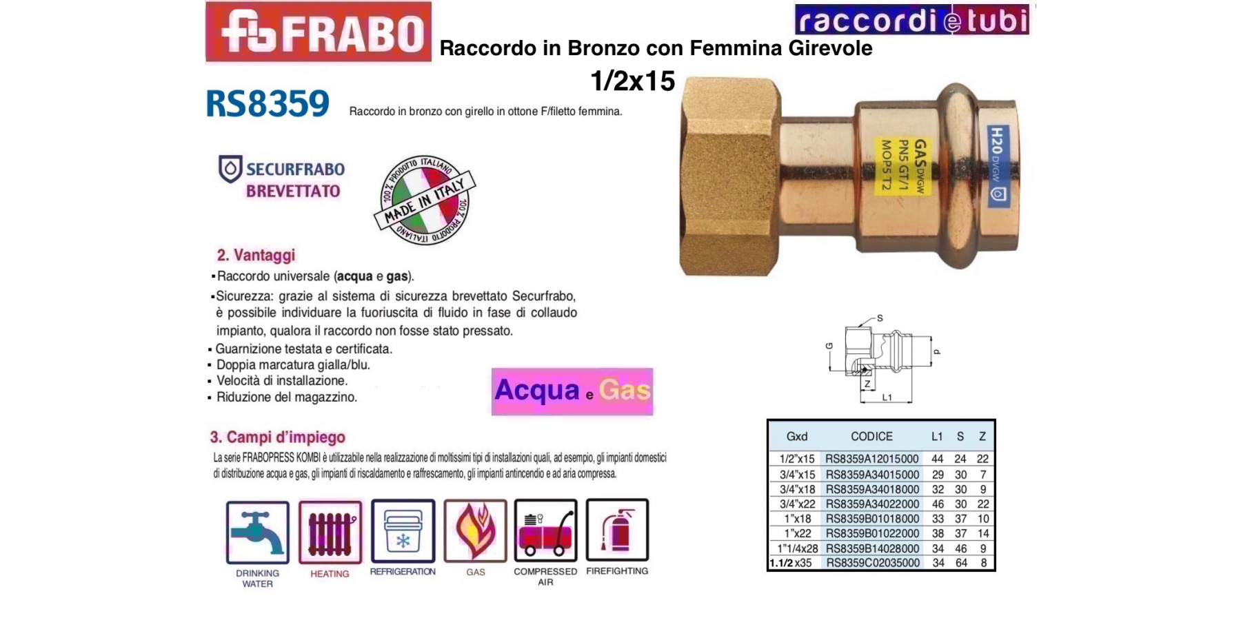 FRABOPRESS KOMBI, con sistema Securfrabo, è una serie costituita da raccordi a pressare in rame e bronzo disponibile nella gamma dimensionale compresa tra 12 e 54 mm, applicabile sia per impianti convoglianti gas che acqua.