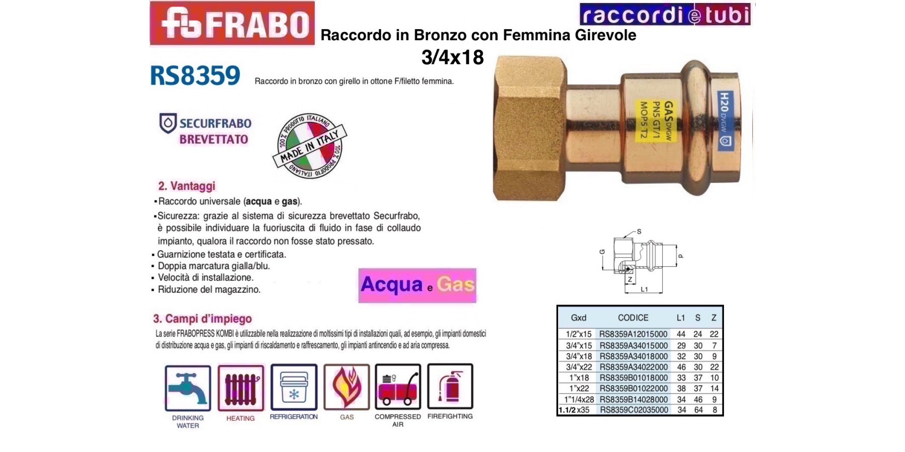FRABOPRESS KOMBI, con sistema Securfrabo, è una serie costituita da raccordi a pressare in rame e bronzo disponibile nella gamma dimensionale compresa tra 12 e 54 mm, applicabile sia per impianti convoglianti gas che acqua.