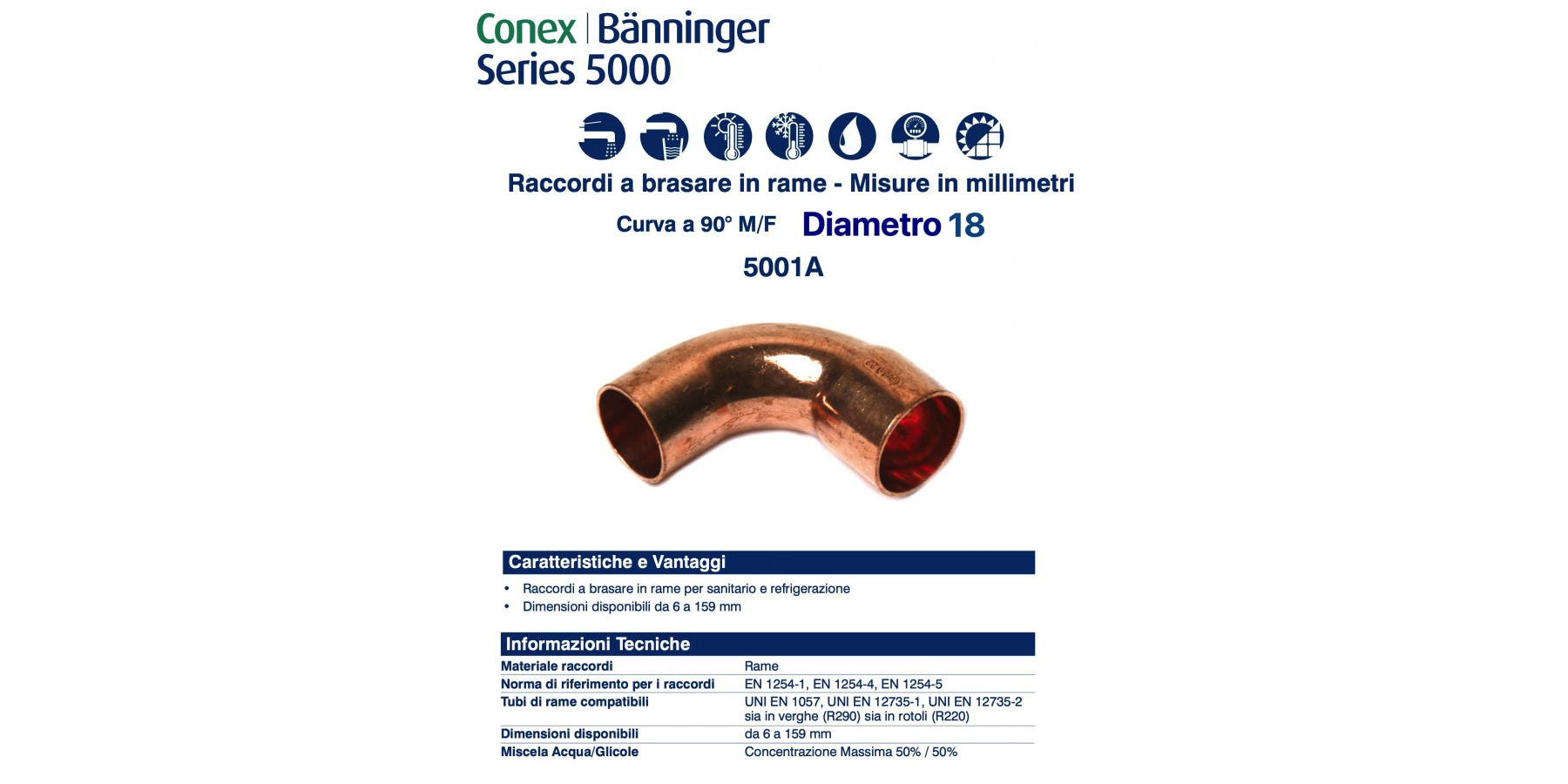 I raccordi della serie 5000 sono prodotti in accordo a UNI EN 1254-1, UNI EN 1254-4 e UNI EN 1254-5 e idonei alla realizzazione di giunzioni in accoppiamento con tubi di rame prodotti secondo UNI EN 1057, UNI EN 12735- 1 e UNI EN 12735-2 . Adatti all'impiego negli impianti di adduzione e distribuzione di acqua fredda e calda, di riscaldamento e raffrescamento, di gas combustibili e refrigeranti.