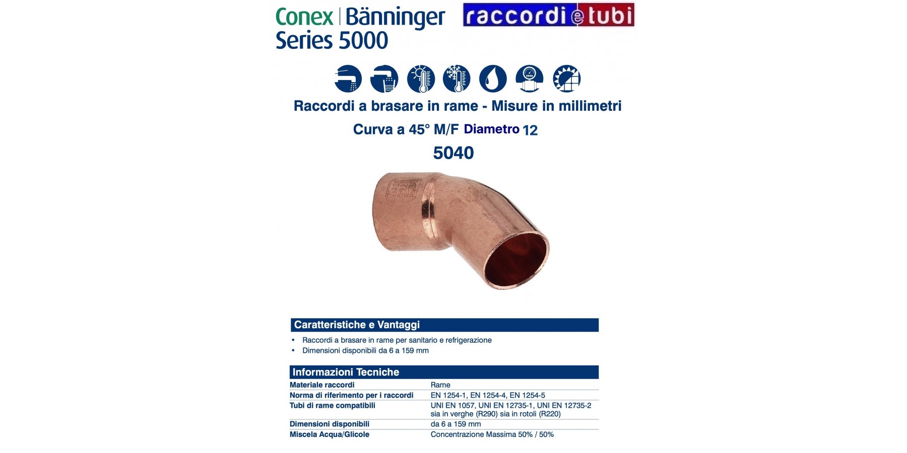 I raccordi della serie 5000 sono prodotti in accordo a UNI EN 1254-1, UNI EN 1254-4 e UNI EN 1254-5 e idonei alla realizzazione di giunzioni in accoppiamento con tubi di rame prodotti secondo UNI EN 1057, UNI EN 12735- 1 e UNI EN 12735-2 . Adatti all'impiego negli impianti di adduzione e distribuzione di acqua fredda e calda, di riscaldamento e raffrescamento, di gas combustibili e refrigeranti.