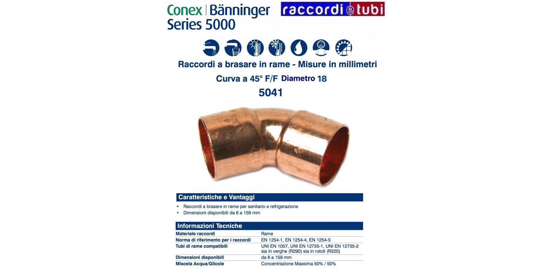 I raccordi della serie 5000 sono prodotti in accordo a UNI EN 1254-1, UNI EN 1254-4 e UNI EN 1254-5 e idonei alla realizzazione di giunzioni in accoppiamento con tubi di rame prodotti secondo UNI EN 1057, UNI EN 12735- 1 e UNI EN 12735-2 . Adatti all'impiego negli impianti di adduzione e distribuzione di acqua fredda e calda, di riscaldamento e raffrescamento, di gas combustibili e refrigeranti.