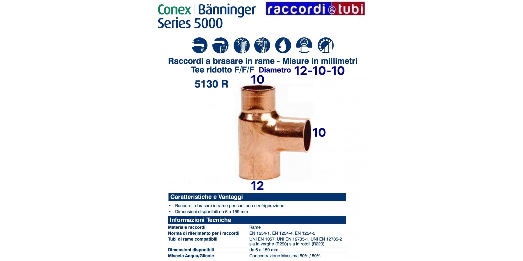 I raccordi della serie 5000 sono prodotti in accordo a UNI EN 1254-1, UNI EN 1254-4 e UNI EN 1254-5 e idonei alla realizzazione di giunzioni in accoppiamento con tubi di rame prodotti secondo UNI EN 1057, UNI EN 12735- 1 e UNI EN 12735-2 . Adatti all'impiego negli impianti di adduzione e distribuzione di acqua fredda e calda, di riscaldamento e raffrescamento, di gas combustibili e refrigeranti.