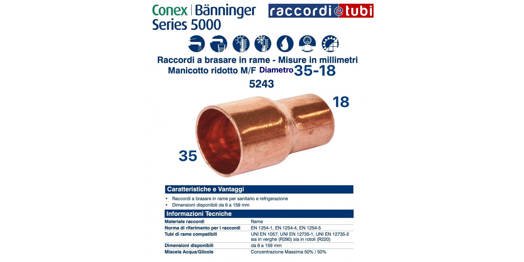 I raccordi della serie 5000 sono prodotti in accordo a UNI EN 1254-1, UNI EN 1254-4 e UNI EN 1254-5 e idonei alla realizzazione di giunzioni in accoppiamento con tubi di rame prodotti secondo UNI EN 1057, UNI EN 12735- 1 e UNI EN 12735-2 . Adatti all'impiego negli impianti di adduzione e distribuzione di acqua fredda e calda, di riscaldamento e raffrescamento, di gas combustibili e refrigeranti.