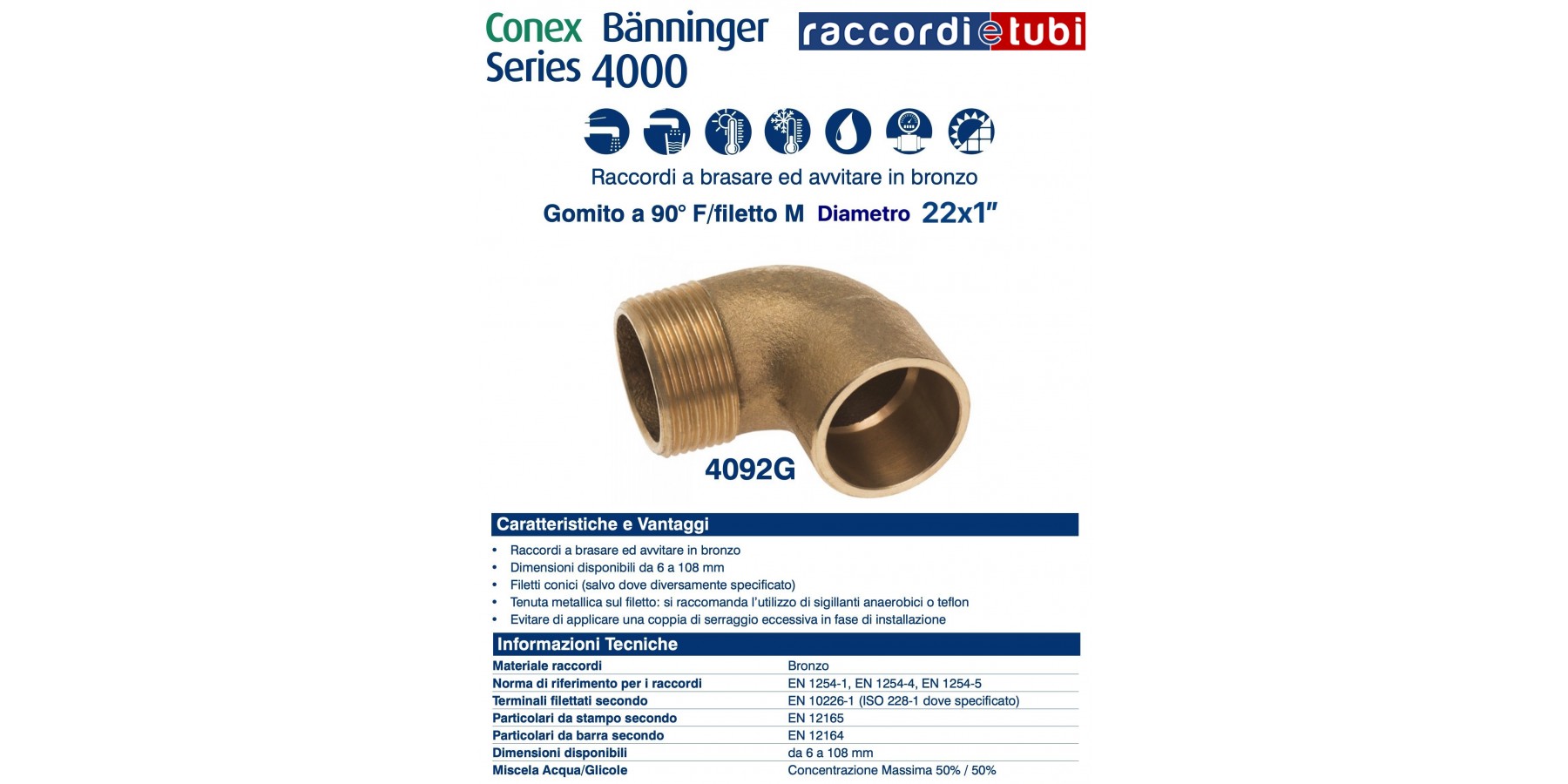 La vasta gamma di raccordi e registri in rame sono disponibili per serie di dimensioni tra 6 mm e 159 millimetri. L'intera produzione è realizzata negli stabilimenti del Gruppo IBP certificati UNI EN ISO 9001, agaranzia del miglioramento continuo e della massima qualità in termini dimensionali e di finitura per tutti gli articoli della serie.