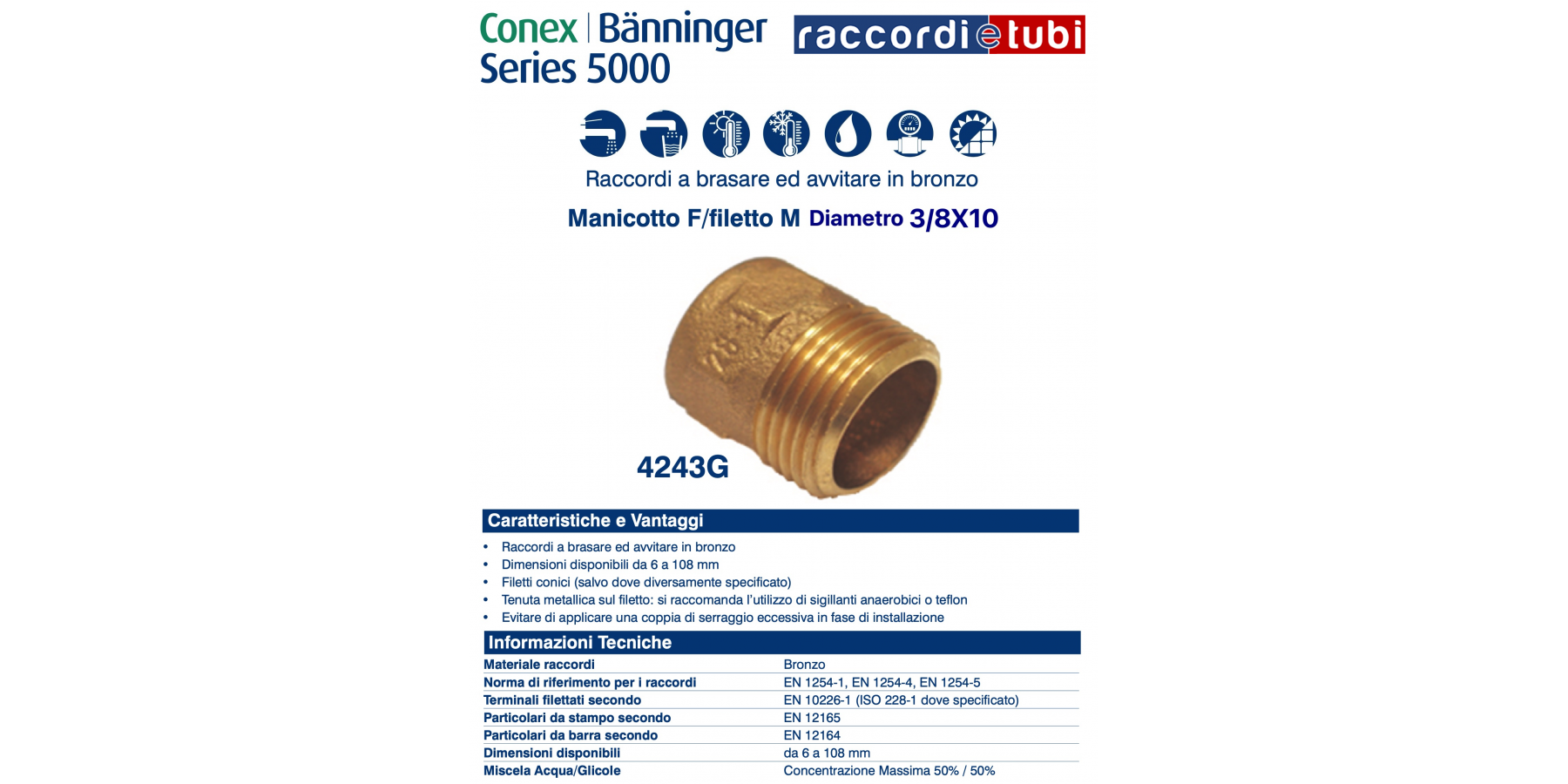 I raccordi della serie 5000 sono prodotti in accordo a UNI EN 1254-1, UNI EN 1254-4 e UNI EN 1254-5 e idonei alla realizzazione di giunzioni in accoppiamento con tubi di rame prodotti secondo UNI EN 1057, UNI EN 12735- 1 e UNI EN 12735-2 . Adatti all'impiego negli impianti di adduzione e distribuzione di acqua fredda e calda, di riscaldamento e raffrescamento, di gas combustibili e refrigeranti.