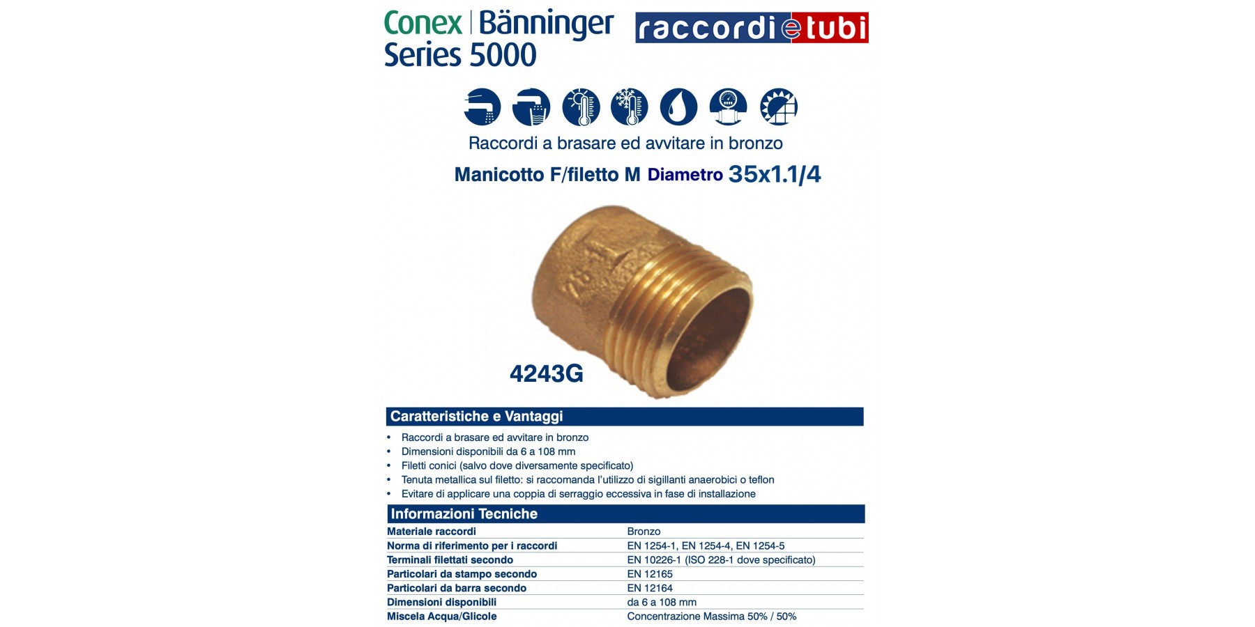 I raccordi della serie 5000 sono prodotti in accordo a UNI EN 1254-1, UNI EN 1254-4 e UNI EN 1254-5 e idonei alla realizzazione di giunzioni in accoppiamento con tubi di rame prodotti secondo UNI EN 1057, UNI EN 12735- 1 e UNI EN 12735-2 . Adatti all'impiego negli impianti di adduzione e distribuzione di acqua fredda e calda, di riscaldamento e raffrescamento, di gas combustibili e refrigeranti.