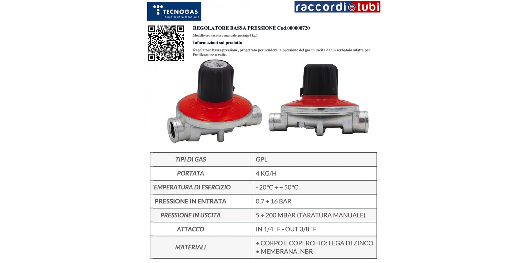 REGOLATORE DI BASSA PRESSIONE PER GPL 4KG/H ART.720