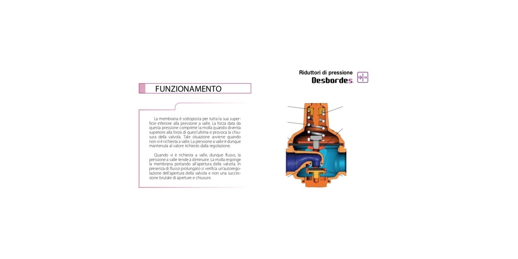 I riduttori di pressione Desbordes 11BIS e 11BIS RC sono provvisti di corpo in bronzo, sono insensibili al calcare e alle impurità dell’acqua e non necessitano di manutenzione. Se impiegati con gas inerti (aria compressa, gas neutri), possono fungere sia da regolatori, sia da riduttori di pressione. Rivolgersi all’azienda per ulteriori informazioni su tali applicazioni. Riduttori di pressione Desbordes 11BIS e 11BIS RC Importante: i valori di temperatura e pressione indicati per le diverse categorie di fluidi (L1/L2/G1/G2) non costituiscono garanzia d’uso. Pertanto è necessario convalidare l’utilizzo del prodotto in determinate condizioni d’esercizio con l’assistenza del nostro ufficio tecnico. Richiedere il manuale d’istruzioni ai nostri uffici commerciali.