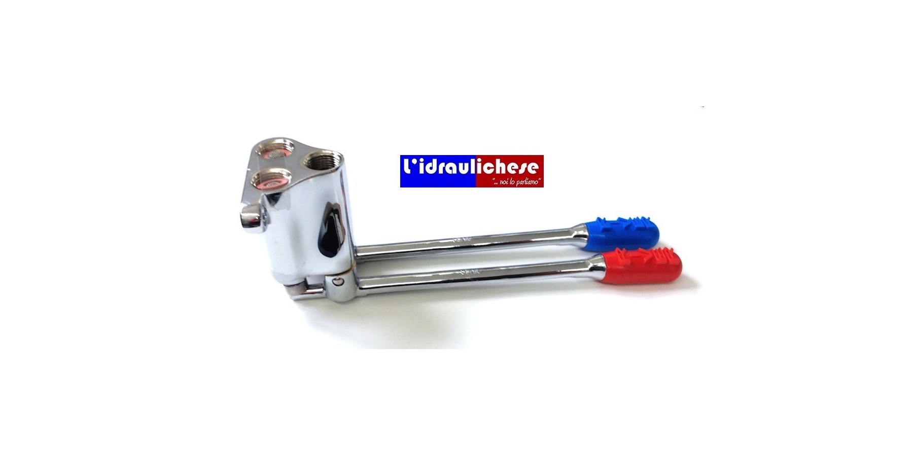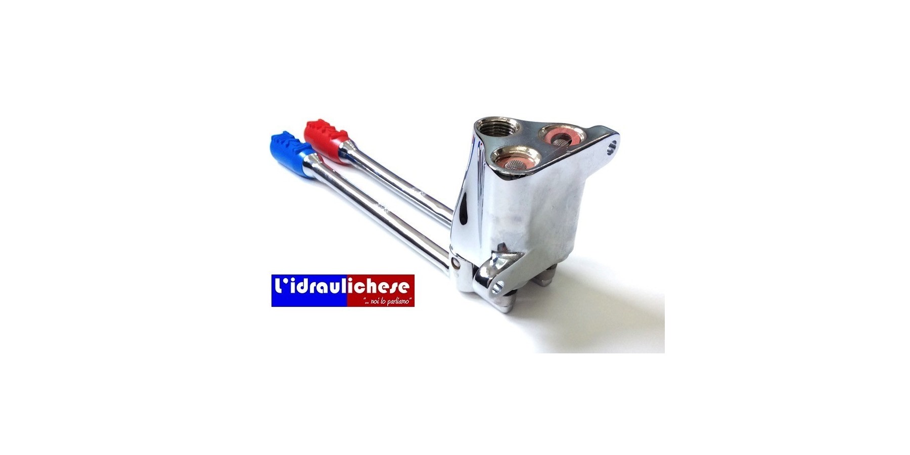 Miscelatore esterno a 2 pedali per il fissaggio a parete – un pedale per acqua solo fredda ed uno per acqua solo calda – premendo contemporaneamente 2 pedali si ottiene una buona miscelazione – può funzionare anche con boiler istantaneo a gas. Le cartucce sono interamente in ottone, con dispositivo anti colpo d’ariete e si possono estrarre facilmente per la re- visione senza togliere il pedale dalla parete e senza smontare i flessibili. In dotazione filtri inox e dima di montaggio – ottone lucidato e cromato