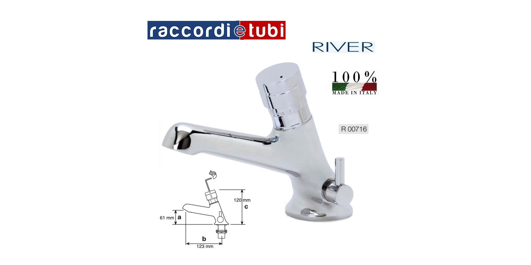 MINIMAGIC – miscelatore lavabo a pulsante – tempo di apertura di circa 20 sec. regolabile con la chiave in dotazione – portata 10 litri/minuto – scelta della temperatura con levetta laterale – completo di n. 2 speciali valvole di non ritorno
