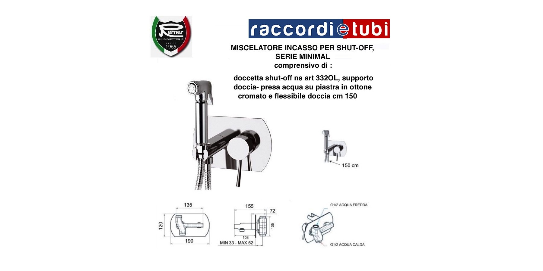 MISCELATORE INCASSO PER SHUT-OFFcomprensivo di : doccetta shut-off ns art 332OL, supporto doccia- presa acqua su piastra in ottone cromato e flessibile doccia cm 150