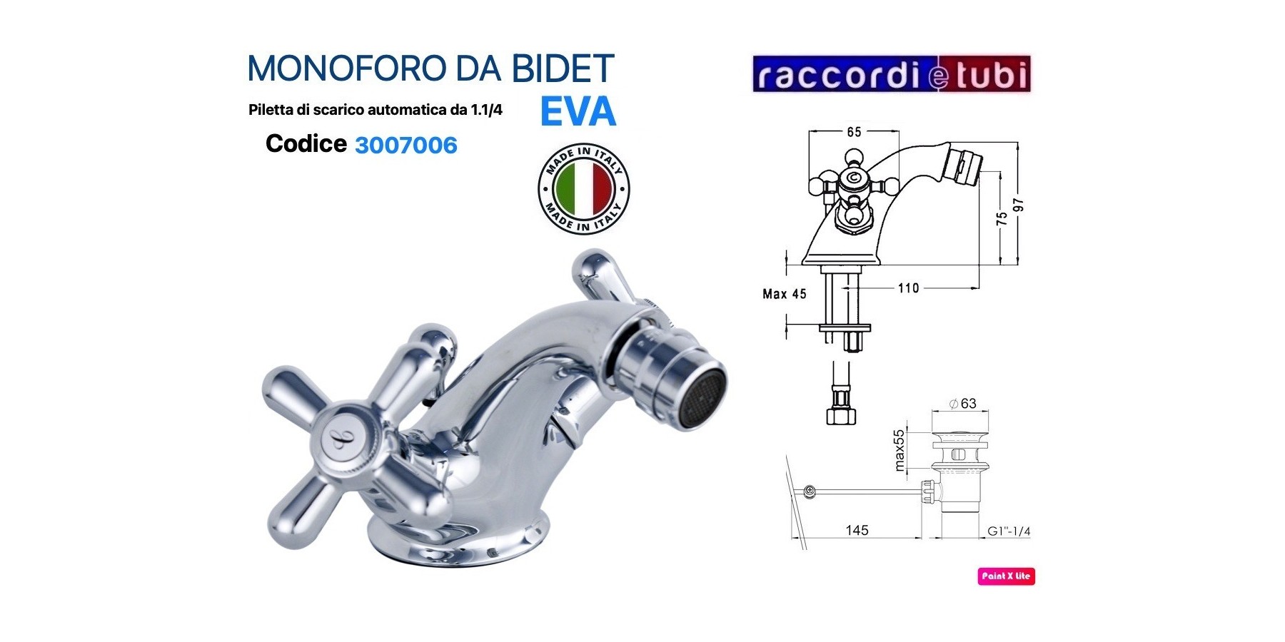 Realizzato in solido ottone cromato, è dotato di scarico da 11/4”.