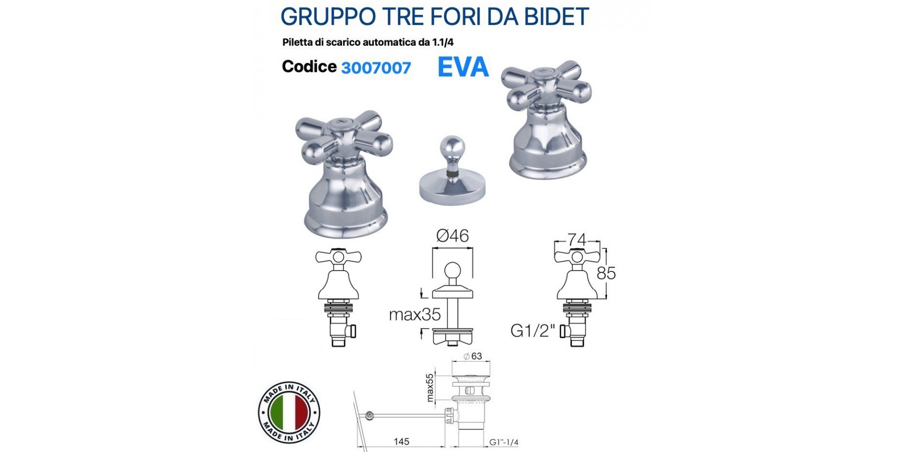 GRUPPO BIDET TRE FORI ANAIS IN OTTONE CROMATO PILETTA AUTOMATICA 1.1/4