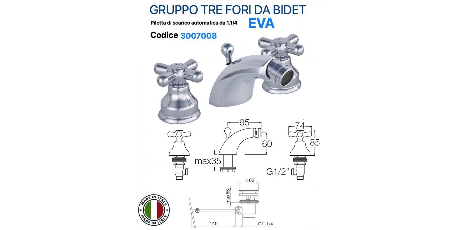GRUPPO BIDET TRE FORI EVA CON EROGAZIONE IN OTTONE CROMATO PILETTA AUTOMATICA 1.1/4