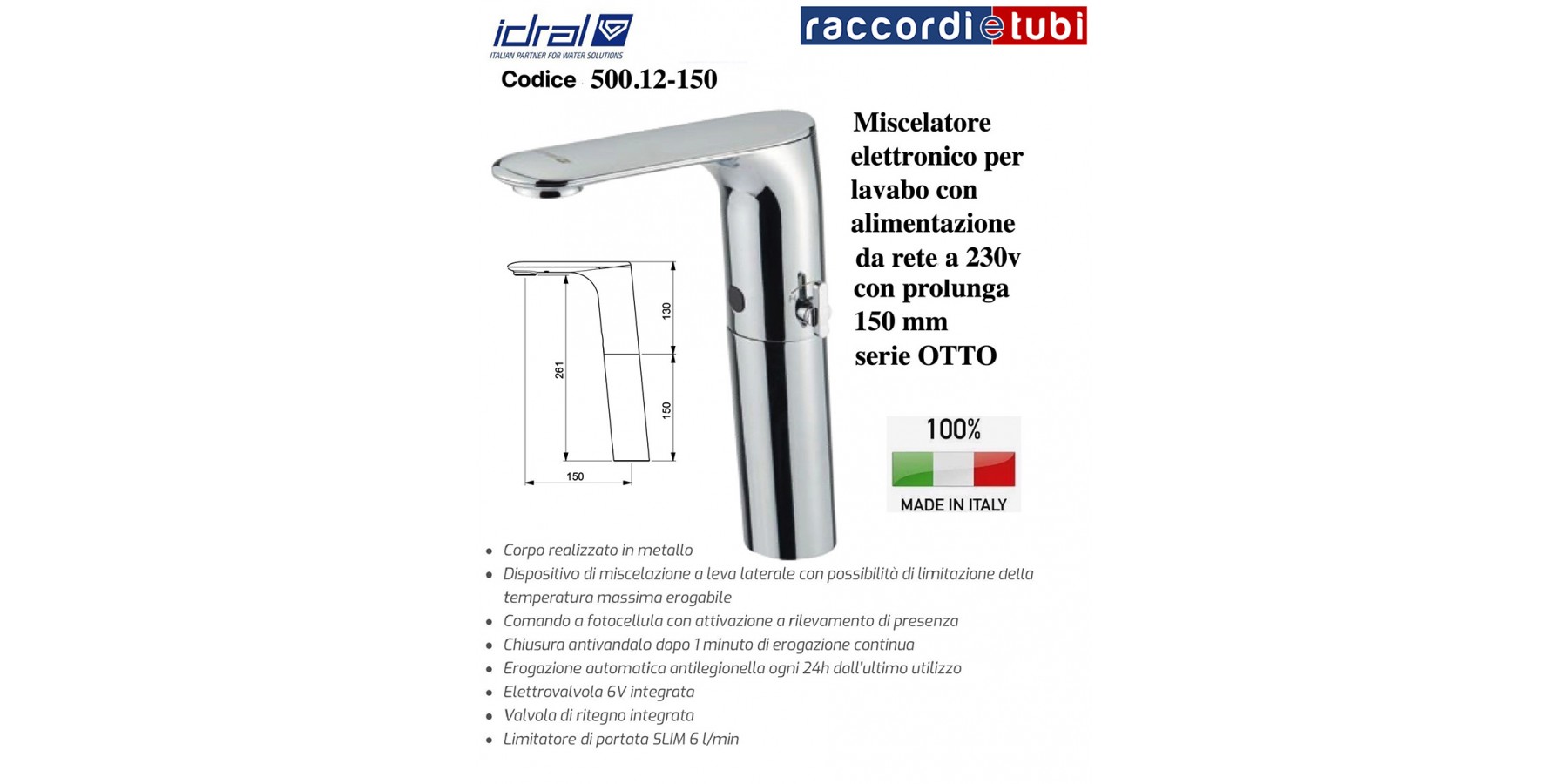 - Corpo base e cover in zamak cromati. - Elettrovalvola bistabile 6 V (interna)