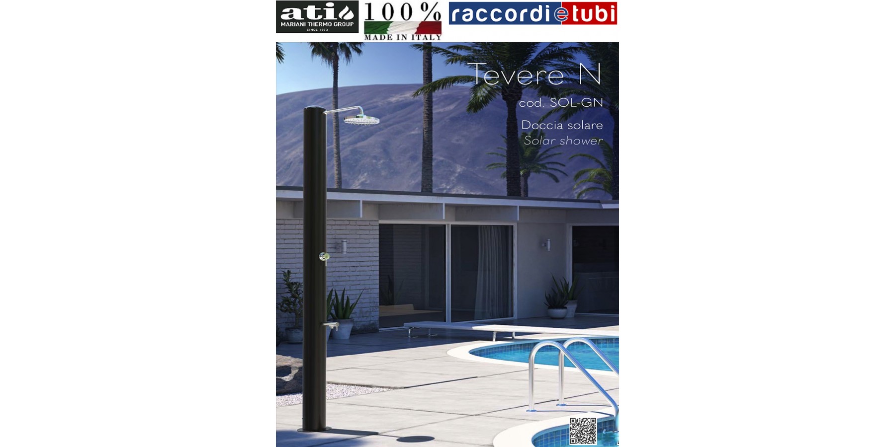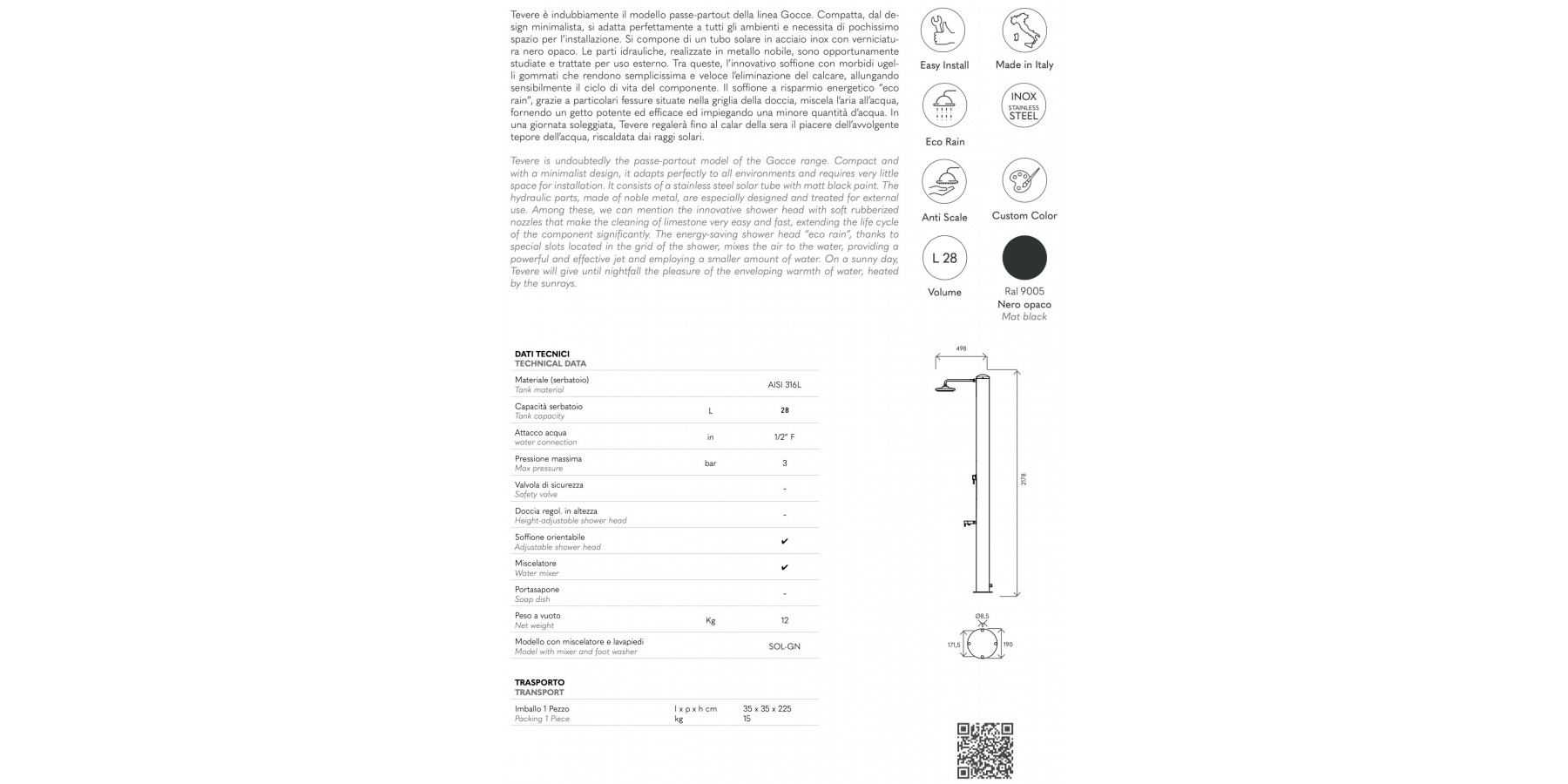 Tevere è indubbiamente il modello passe-partout della linea Gocce. Compatta, dal de- sign minimalista, si adatta perfettamente a tutti gli ambienti e necessita di pochissimo spazio per l’installazione. Si compone di un tubo solare in acciaio inox con verniciatu- ra nero opaco. Le parti idrauliche, realizzate in metallo nobile, sono opportunamente studiate e trattate per uso esterno. Tra queste, l’innovativo soffione con morbidi ugel- li gommati che rendono semplicissima e veloce l’eliminazione del calcare, allungando sensibilmente il ciclo di vita del componente. Il soffione a risparmio energetico “eco rain”, grazie a particolari fessure situate nella griglia della doccia, miscela l’aria all’acqua, fornendo un getto potente ed efficace ed impiegando una minore quantità d’acqua. In una giornata soleggiata, Tevere regalerà fino al calar della sera il piacere dell’avvolgente tepore dell’acqua, riscaldata dai raggi solari