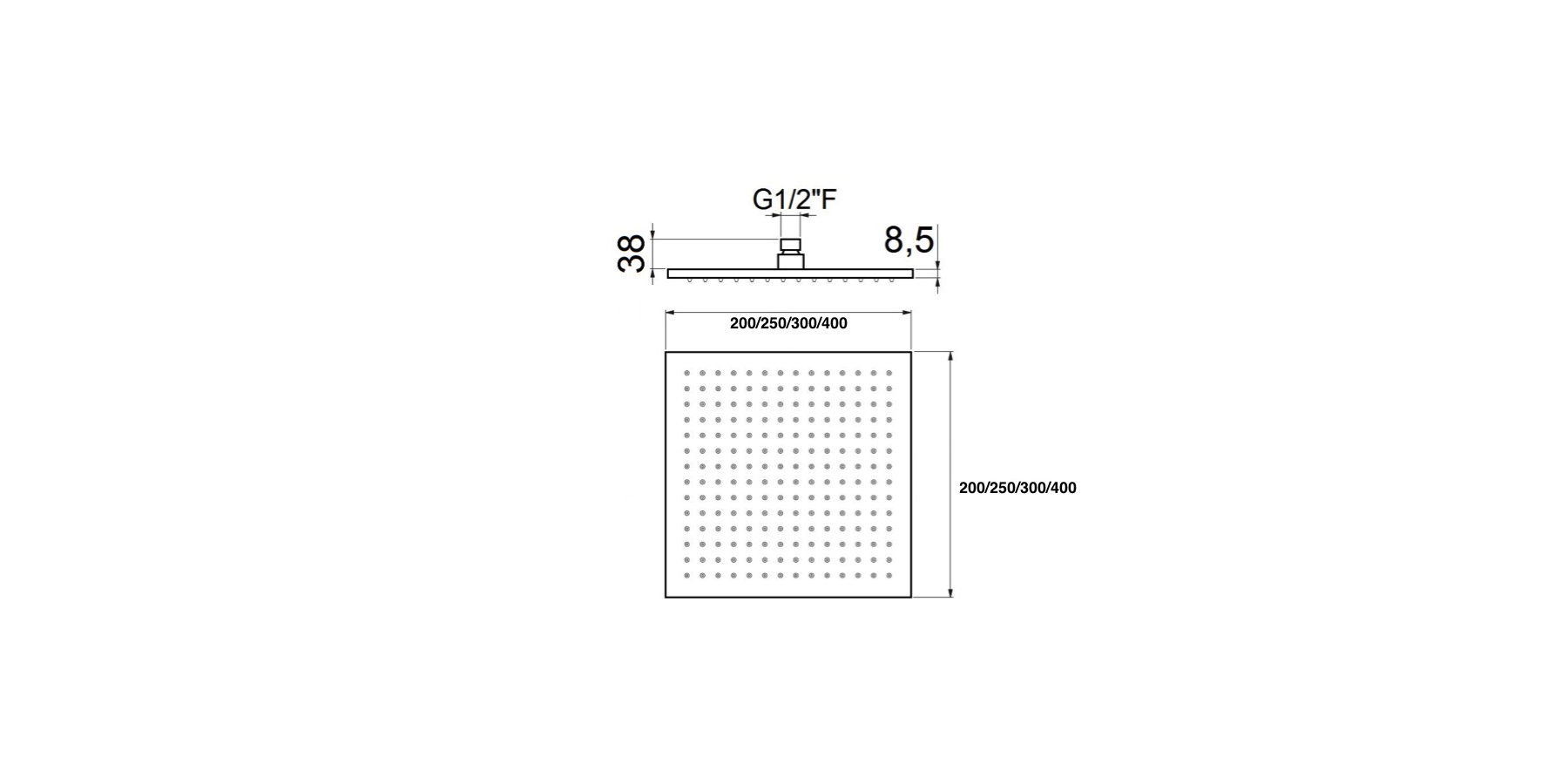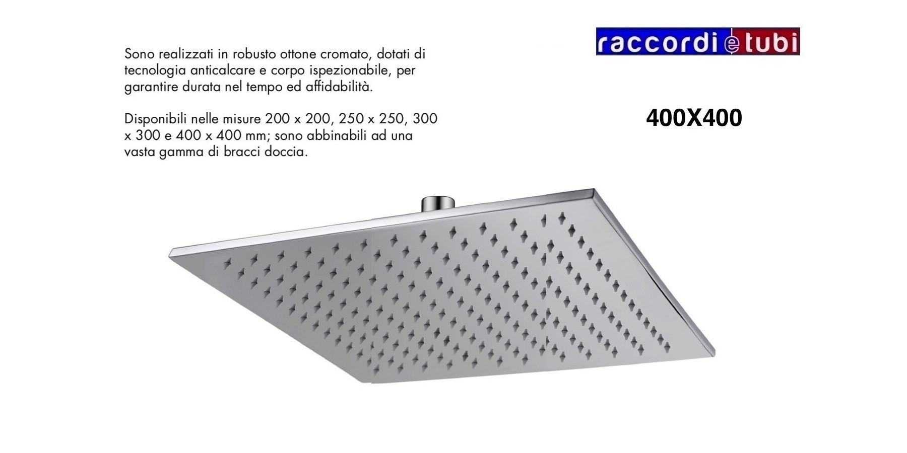 Disponibili nelle misure 200 x 200, 250 x 250, 300 x 300 e 400 x 400 mm; sono abbinabili ad una vasta gamma di bracci doccia.