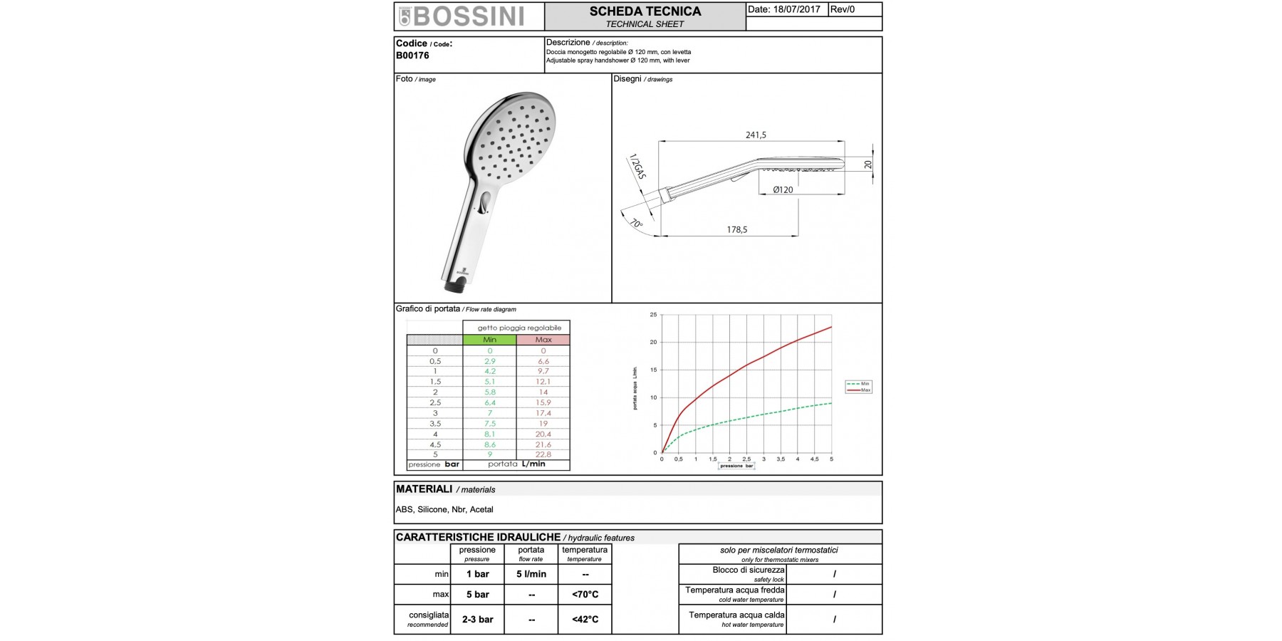 Kit asta saliscendi estensibile Ø 24 mm in ottone con 2 supporti doccia - doccia AGUA-LIFE Ø 120 mm - flessibile ottone doppia aggraffatura cm 175