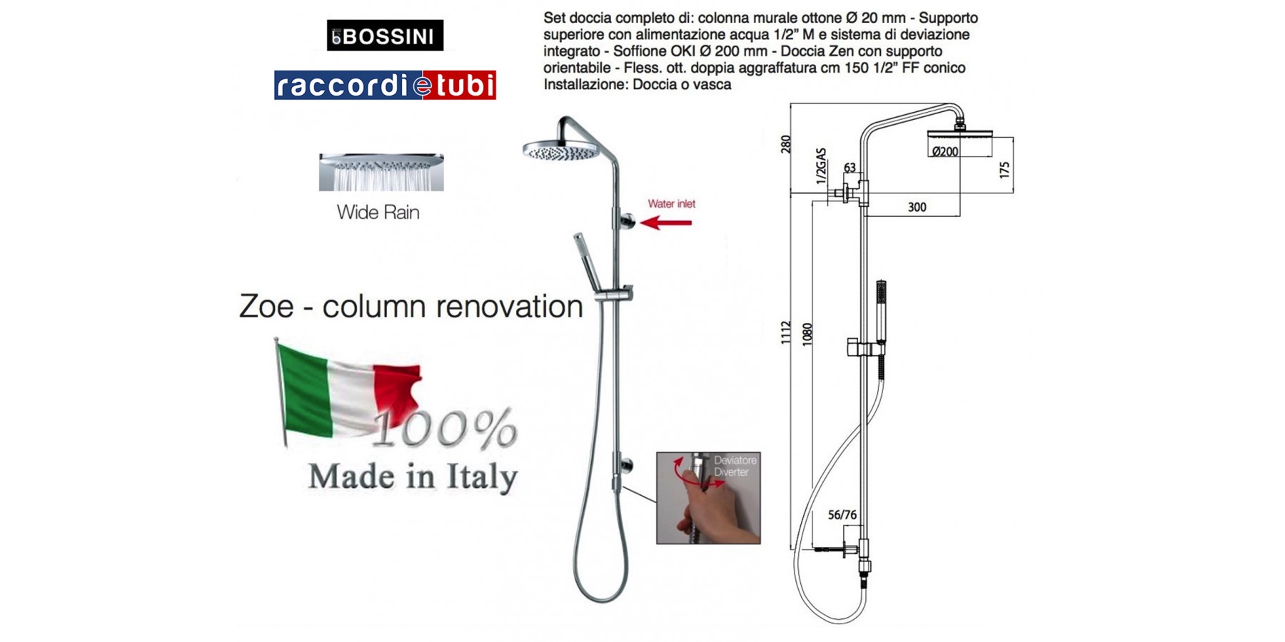 Set doccia completo di: colonna murale ottone Ø 20 mm - Supporto superiore con alimentazione acqua 1/2” M e sistema di deviazione integrato - Soffione OKI Ø 200 mm - Doccia Zen con supporto orientabile - Fless. ott. doppia aggraffatura cm 150 1/2” FF conico Installazione: Doccia o vasca