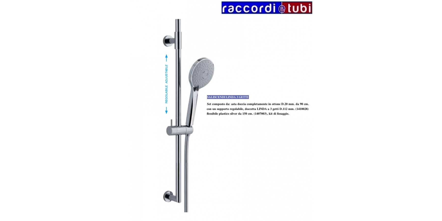 Set composto da: asta doccia completamente in ottone D.20 mm. da 90 cm. con un supporto regolabile, doccetta LINDA a 3 getti D.112 mm. (1410028), fl essibile plastico silver da 150 cm. (1407003), kit di fi ssaggio.