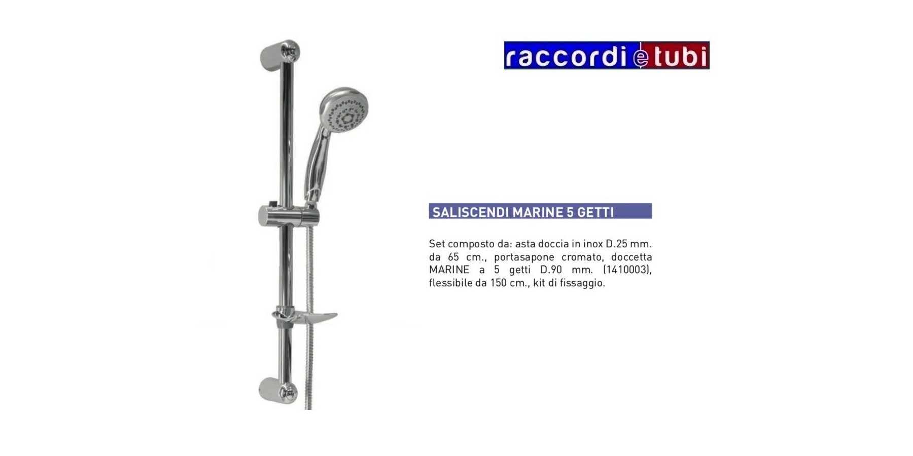Set composto da: asta doccia in inox D.25 mm. da 65 cm., portasapone cromato, doccetta MARINE a 5 getti D.90 mm. (1410003), fl essibile da 150 cm., kit di fi ssaggio.