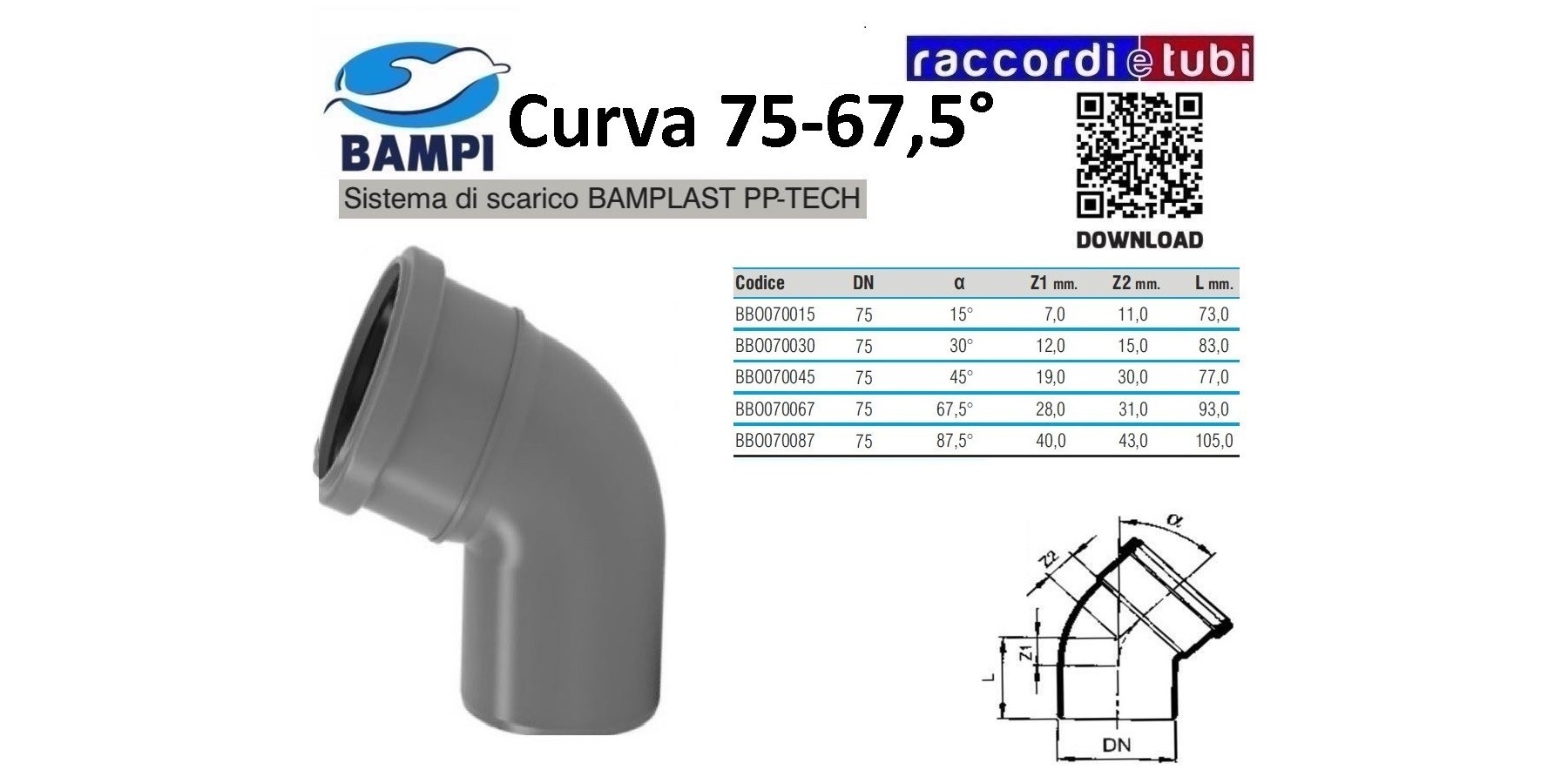 CURVA A INNESTO PP-H/MC DIAMETRO 75-67,5°