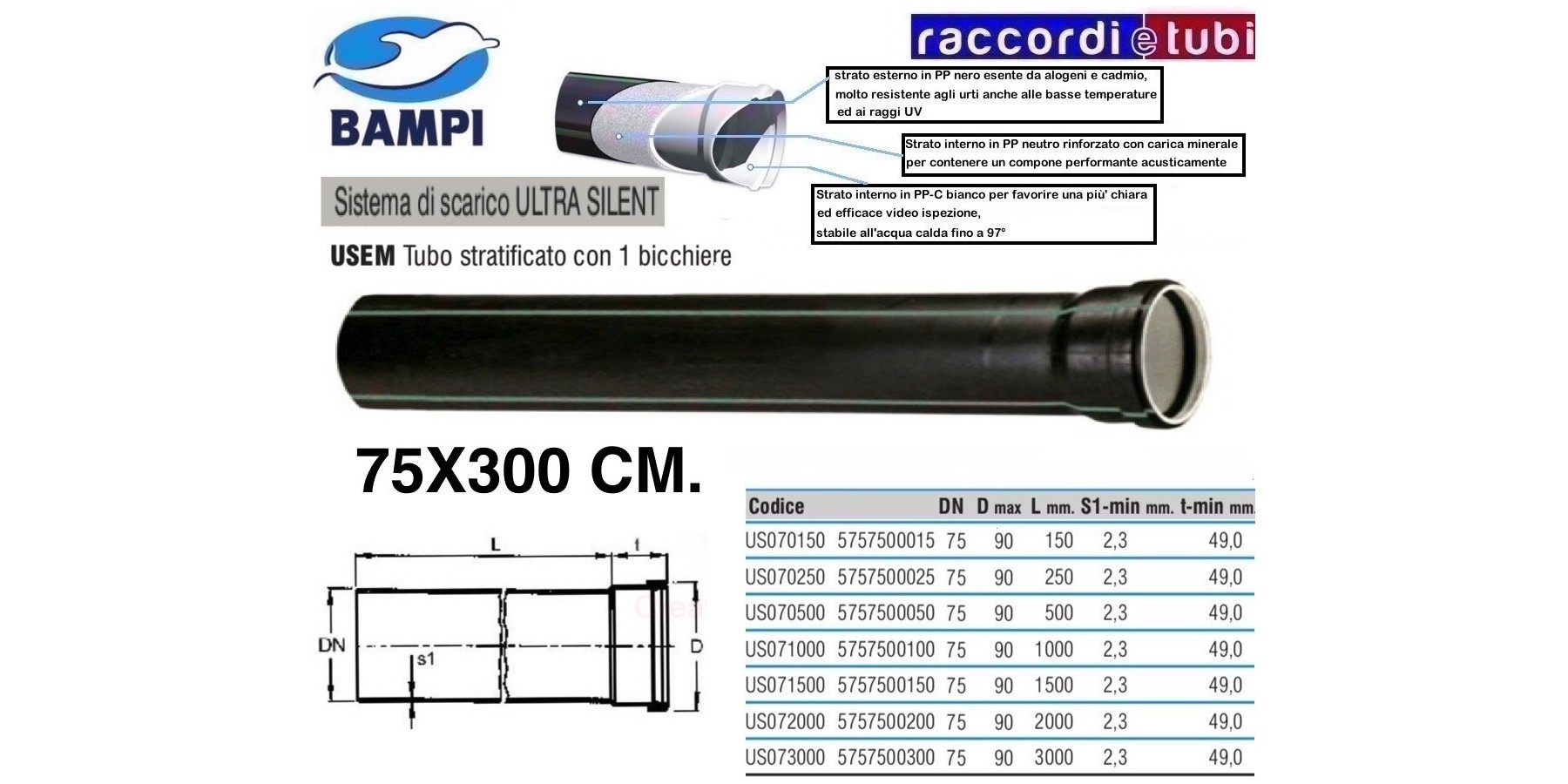 - Livello acustico pari a 23 dB/(A) Lin rilevato in laboratorio in ambiente di prova con 2 piani di caduta e fonometro posizionato al piano più basso, con portata di scarico di 4 litri/secondo (pari a 2 cassette wc scaricate contemporaneamente) e collari di fissaggio di uso comune normalmente in dotazione agli installatori idraulici (tipo Mupro giallo).